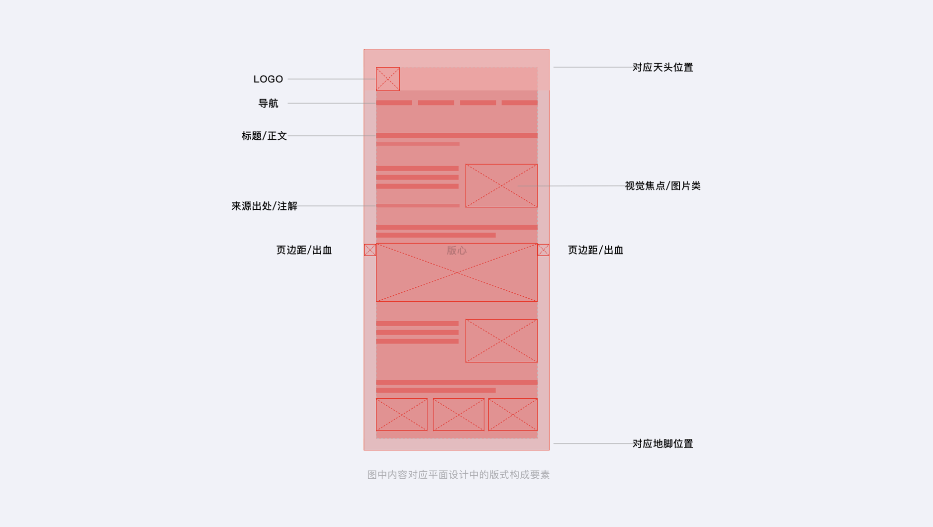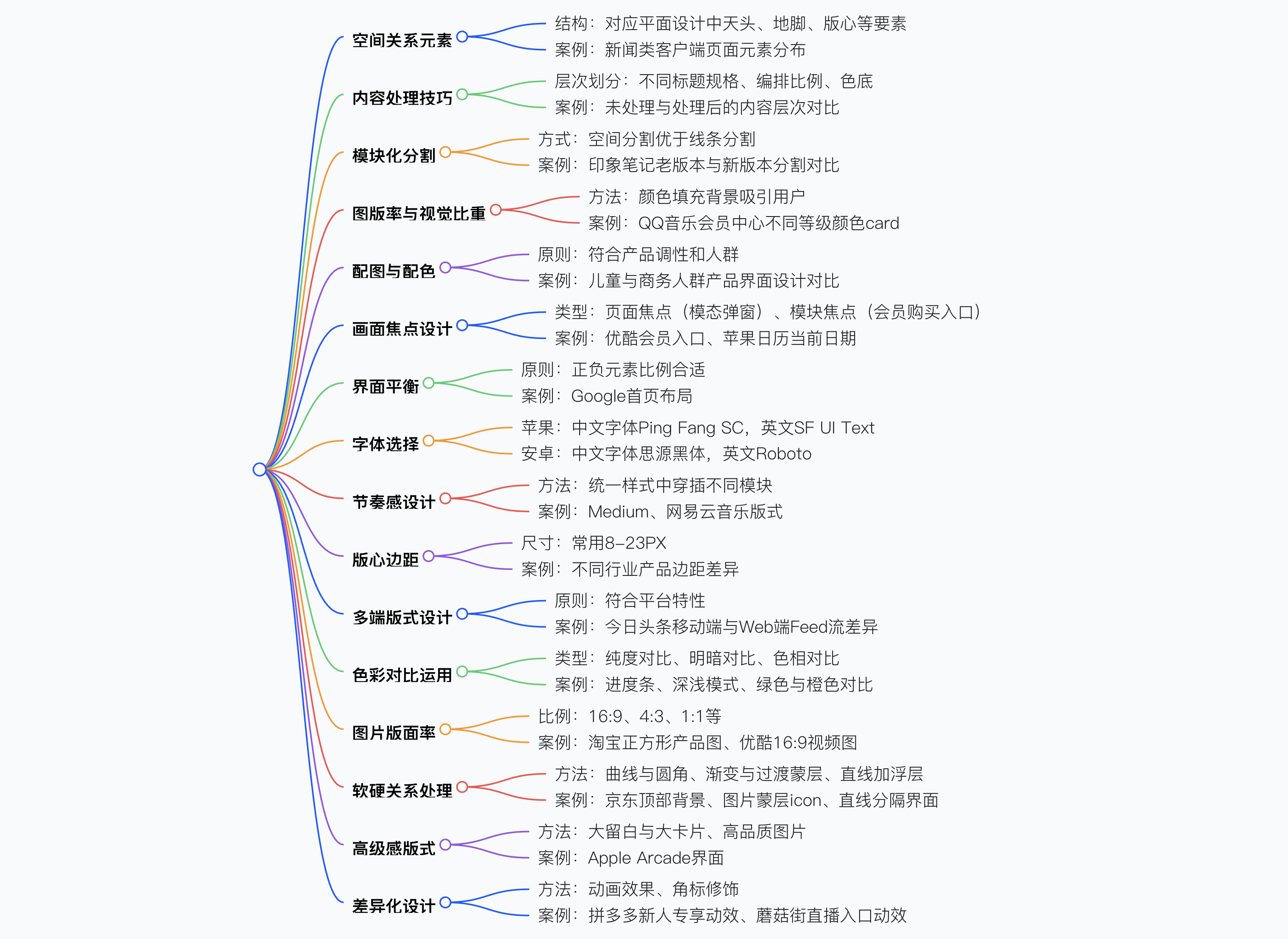 - 空間關(guān)系元素:運(yùn)用平面設(shè)計(jì)中的天頭(LOGO、導(dǎo)航)、版心(標(biāo)題 / 正文、視覺(jué)焦點(diǎn))、地腳(來(lái)源出處)等結(jié)構(gòu)思考 UI 界面布局,如新聞?lì)惪蛻?hù)端頁(yè)面元素對(duì)應(yīng)分布。