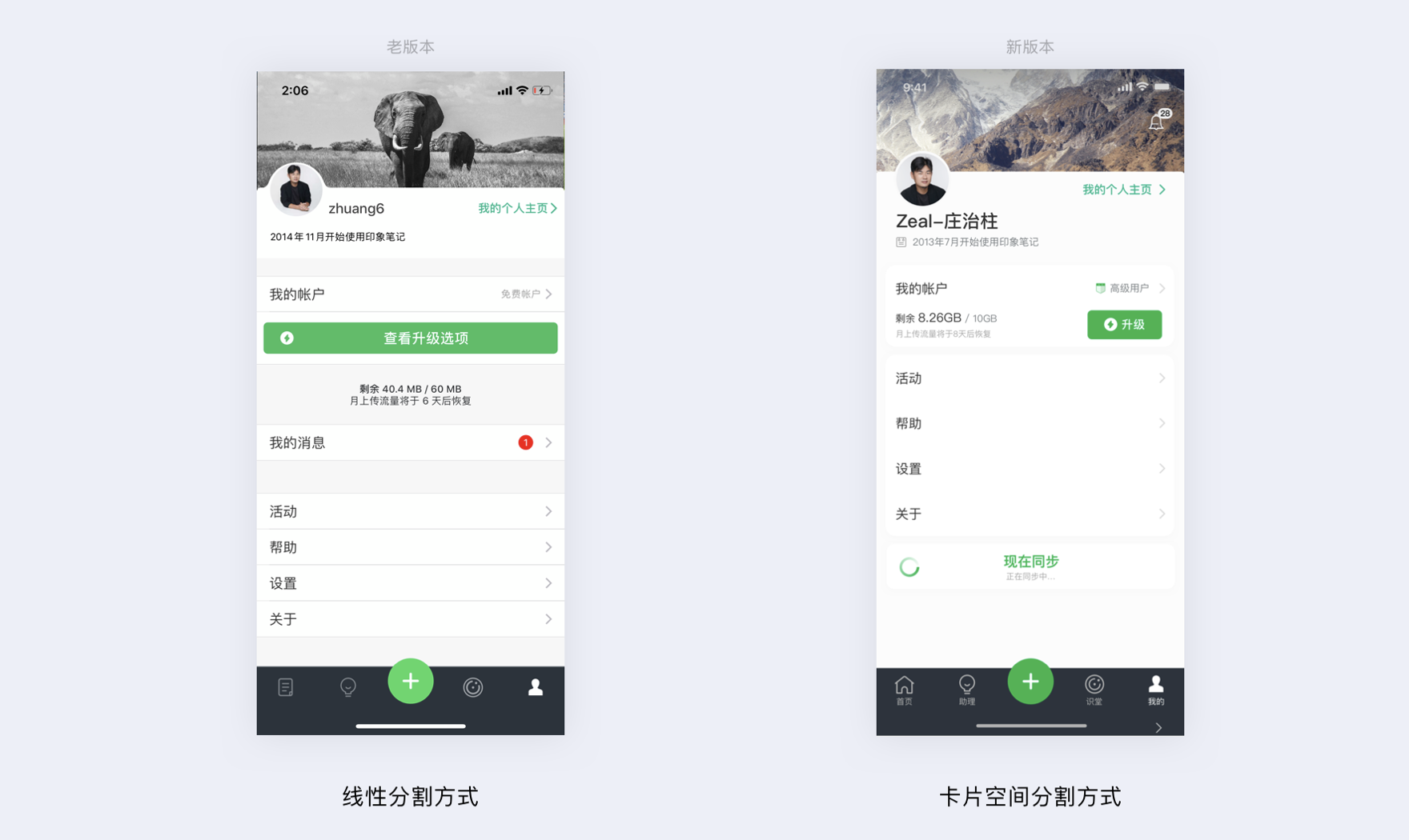 - 模塊化分割:空間分割比線條分割給人更輕松的閱讀感受,如印象筆記老版本(線性分割)與新版本(卡片空間分割)對(duì)比。