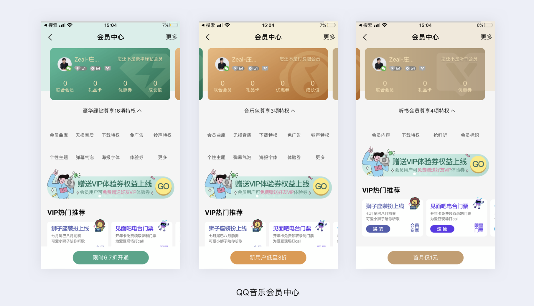 - 圖版率與視覺(jué)比重:通過(guò)顏色填充背景改變界面專(zhuān)屬比重,引導(dǎo)視覺(jué),如 QQ 音樂(lè)會(huì)員中心不同等級(jí)對(duì)應(yīng)不同顏色 card。