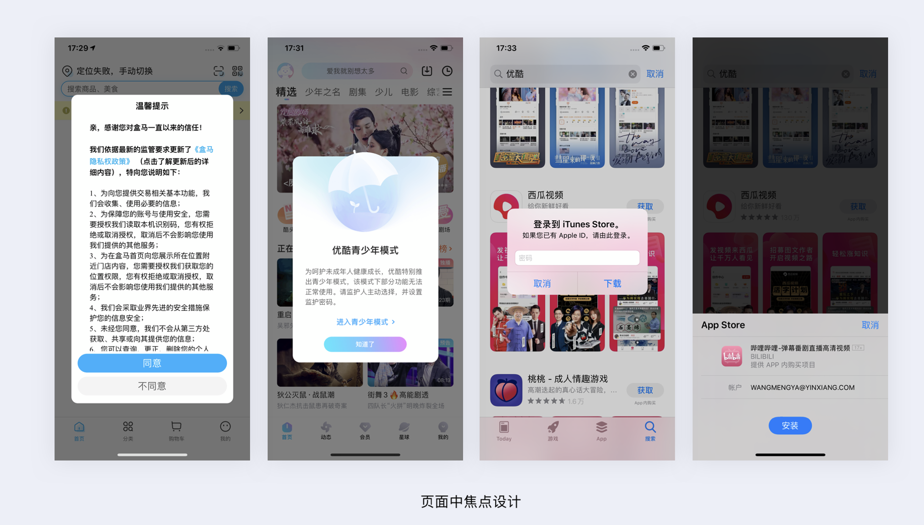 - 頁(yè)面焦點(diǎn):采用模態(tài)彈窗等不可忽視的方式,如盒馬隱私政策彈窗。