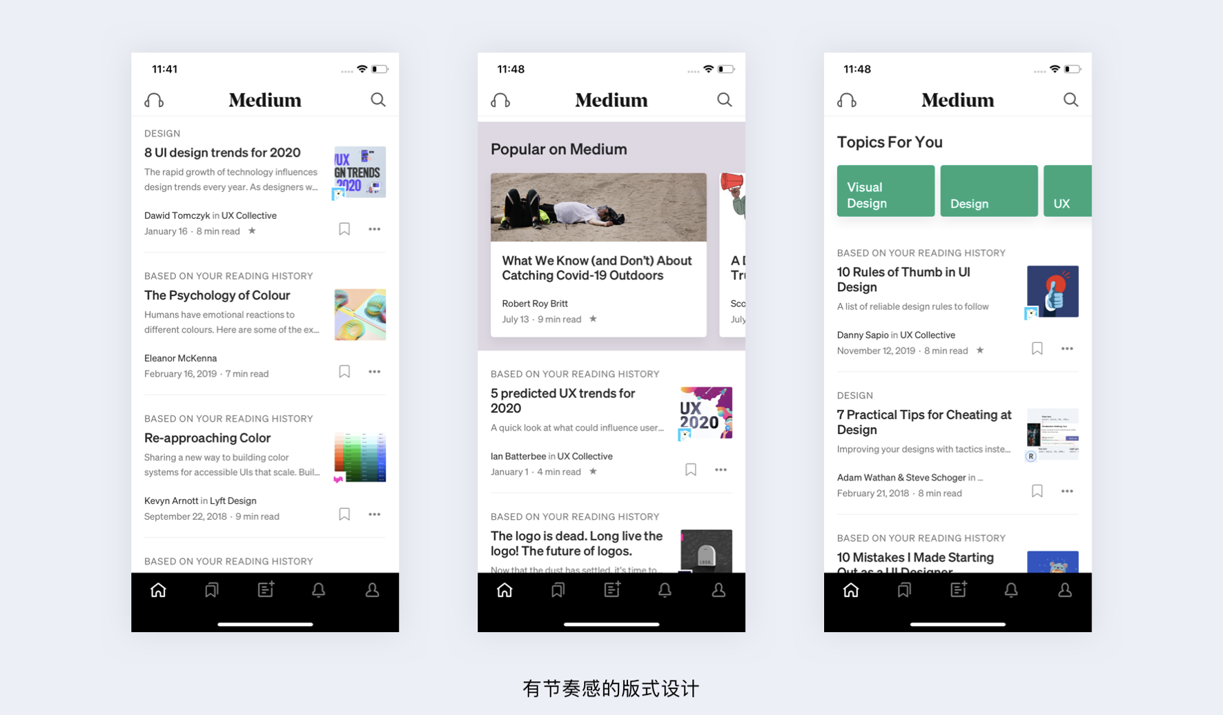 - 節(jié)奏感設(shè)計(jì):在統(tǒng)一樣式中穿插不同模塊,如 Medium、網(wǎng)易云音樂(lè)的版式設(shè)計(jì)。