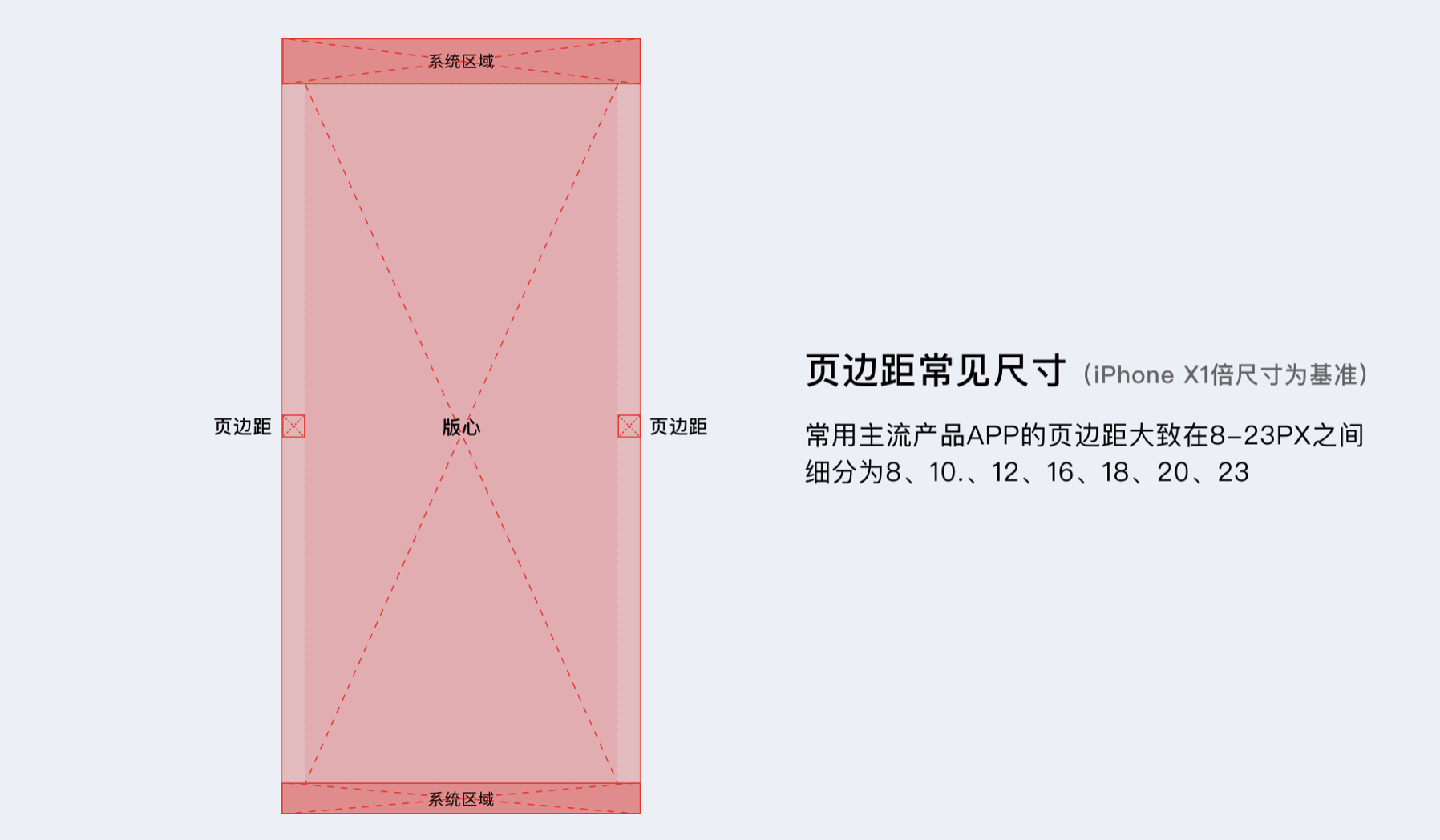 - 版心邊距:常用尺寸 8-23PX(以 iPhone X1 倍尺寸為基準(zhǔn)),內(nèi)容多的文字類(lèi)和購(gòu)物類(lèi)產(chǎn)品邊距較小,圖片、視頻類(lèi)產(chǎn)品邊距較大。