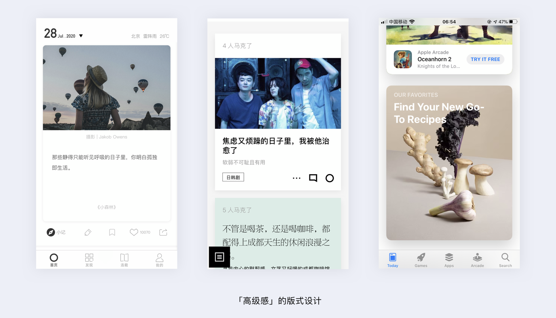 - 高級(jí)感版式:利用大留白、大卡片、高品質(zhì)圖片,如 Apple Arcade 界面。