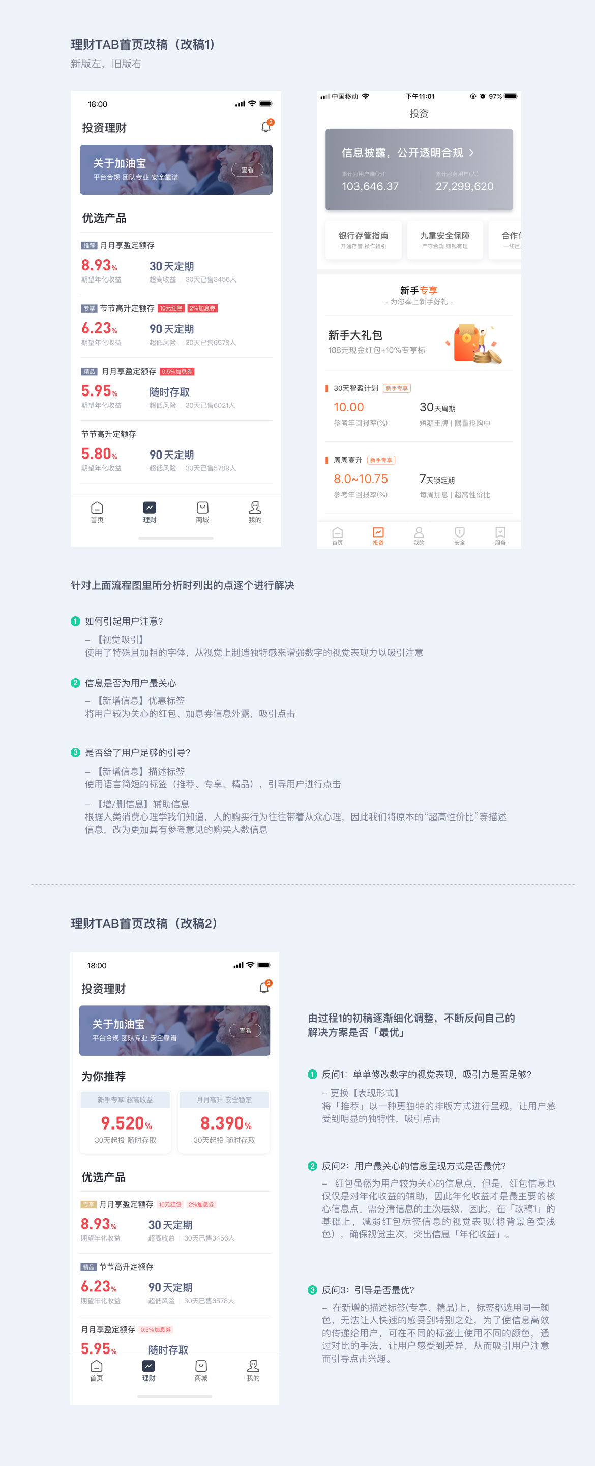 - 6.0 改版措施:將收益數(shù)字從 “7.00%” 改為 “9.520%” 并加粗,添加 “新手專享 188 元紅包 + 10% 專享標(biāo)” 等信息,增加「推薦」「精品」標(biāo)簽。