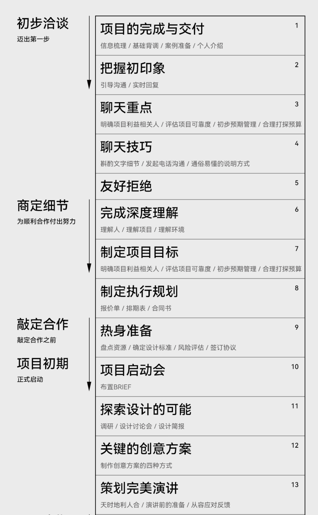 整個(gè)項(xiàng)目流程按階段分為初步洽談、商定細(xì)節(jié)、敲定合作、項(xiàng)目初期、項(xiàng)目中期、項(xiàng)目尾期及項(xiàng)目背后的努力,各階段關(guān)鍵要點(diǎn)如下:
