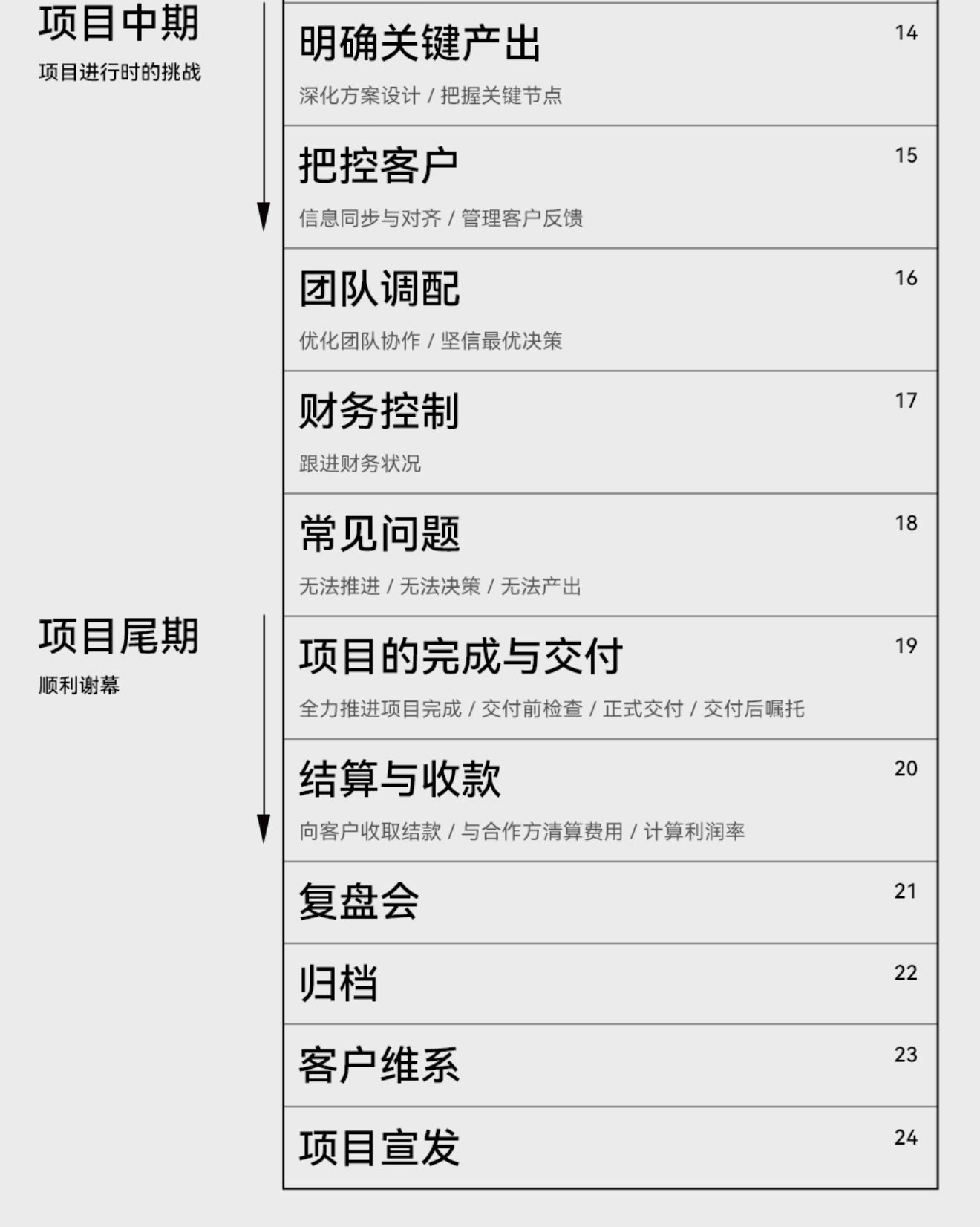 5. 項(xiàng)目中期(項(xiàng)目進(jìn)行時(shí)的挑戰(zhàn)):明確關(guān)鍵產(chǎn)出,深化方案設(shè)計(jì)并把握關(guān)鍵節(jié)點(diǎn);把控客戶方面,做好信息同步與對(duì)齊,管理客戶反饋;進(jìn)行團(tuán)隊(duì)調(diào)配,優(yōu)化協(xié)作并堅(jiān)信最優(yōu)決策;做好財(cái)務(wù)控制,跟進(jìn)財(cái)務(wù)狀況;應(yīng)對(duì)常見問題,如項(xiàng)目無法推進(jìn)、決策受阻、產(chǎn)出困難等。