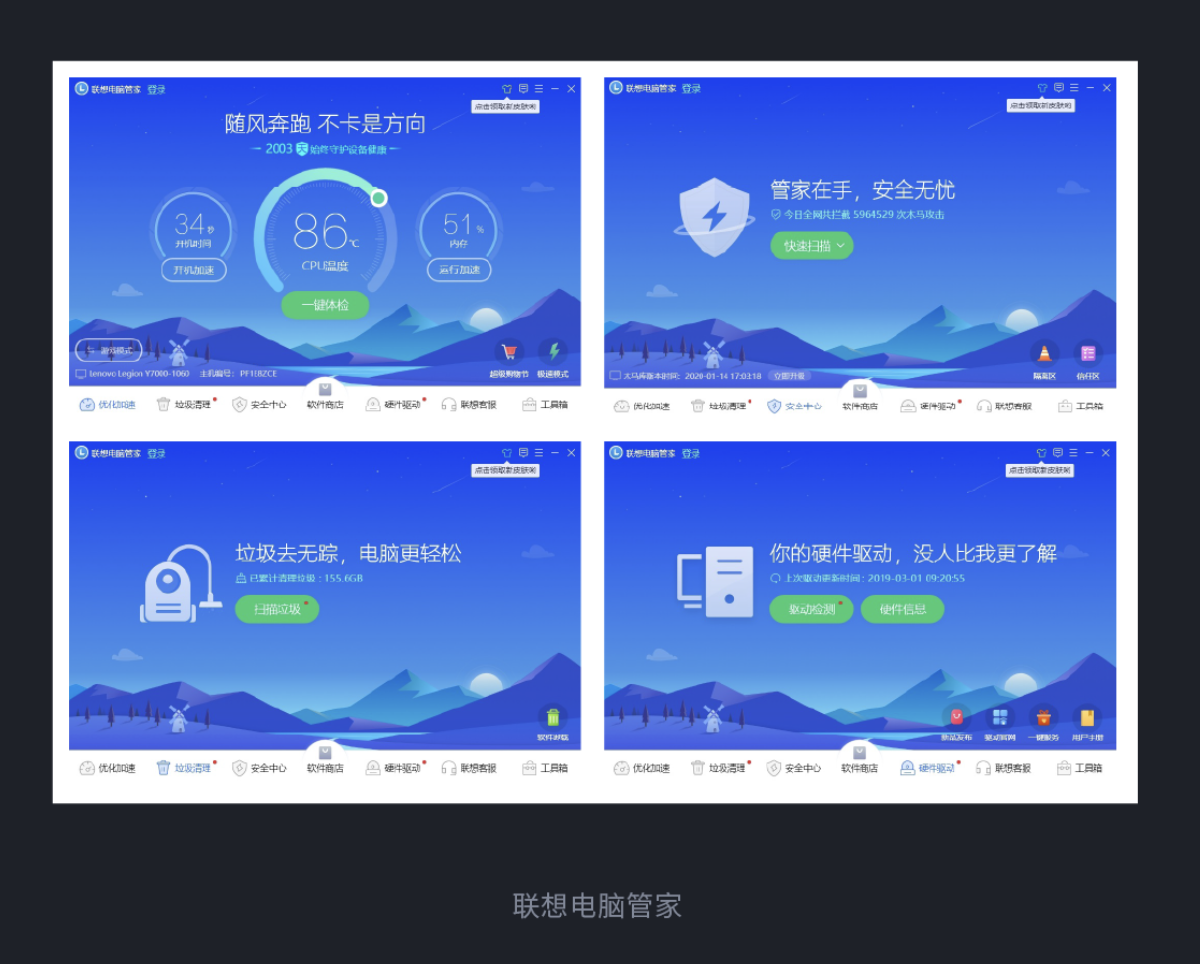 一致性設計能降低用戶學習成本、提升研發(fā)效率。布局一致性要保持統(tǒng)一結(jié)構(gòu),減少用戶對新結(jié)構(gòu)的思考負擔。色彩一致性要求主色調(diào)統(tǒng)一傳遞品牌印象,功能性色彩形成固定規(guī)則。操作一致性是指同類功能操作邏輯統(tǒng)一,降低學習成本。反饋一致性要讓系統(tǒng)對同類操作的反饋方式統(tǒng)一,讓用戶與系統(tǒng) “溝通順暢”。文字一致性要求文字大小、顏色、風格統(tǒng)一,避免用戶因 “格式混亂” 產(chǎn)生誤解。聲音一致性要使操作提示音固定,強化用戶對操作結(jié)果的預判。聯(lián)想電腦管家的優(yōu)化加速、垃圾清理等模塊,在布局、文字、反饋方式上保持一致,既提升了用戶體驗,也降低了研發(fā)成本。