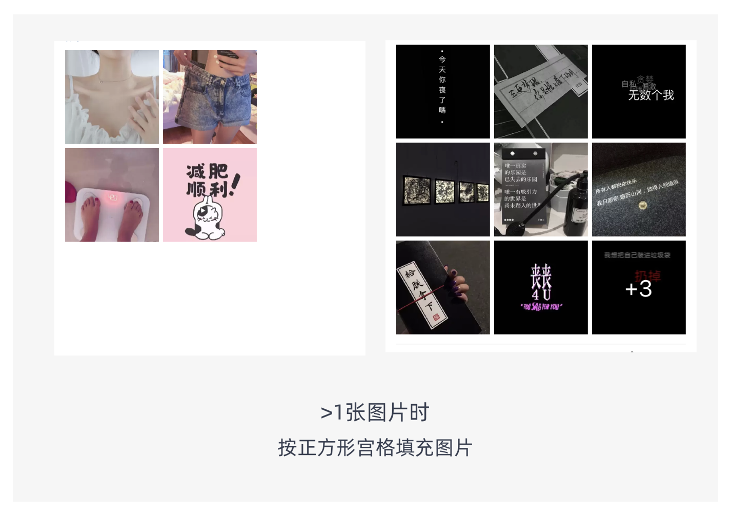 宮格式布局是指用戶上傳的圖片會(huì)適配到一個(gè)個(gè)的方格中,常見的排版有 3 宮格、6 宮格、9 宮格。它多應(yīng)用在社交類的 APP 中或者電商 APP 的內(nèi)容社區(qū),如微博、微信、QQ 空間等社交 APP,以及淘寶等電商應(yīng)用的內(nèi)容社區(qū)。