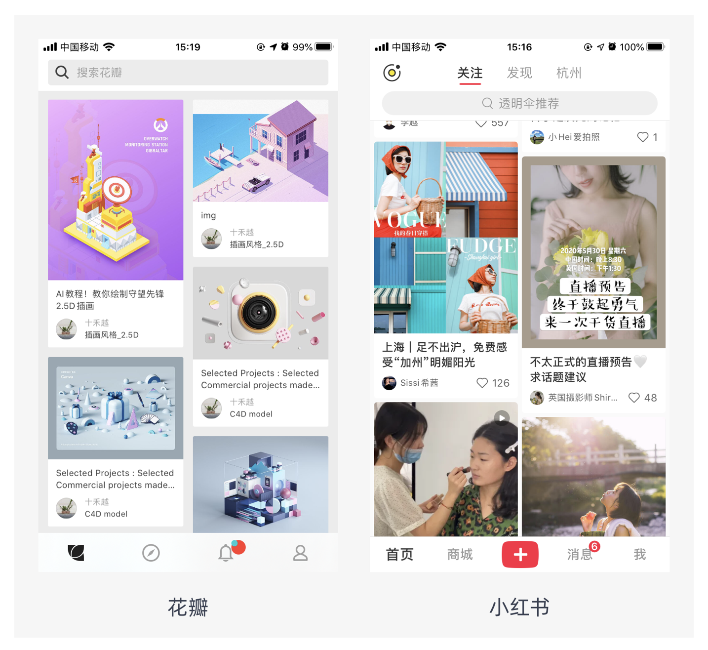 瀑布流式布局的視覺表現(xiàn)為參差不齊的多欄布局,用戶的視線軌跡以 Z 型為主,這種軌跡易于閱讀。但由于用戶采用 “就近原則” 閱讀信息,容易產(chǎn)生漏讀現(xiàn)象。它適用于社區(qū)類瀏覽型頁面,這類頁面往往信息量大,采用瀑布流式布局能讓瀏覽體驗(yàn)更為流暢,如花瓣、小紅書等平臺(tái),用戶可以不斷下拉獲取更多內(nèi)容,沉浸在瀏覽過程中。
