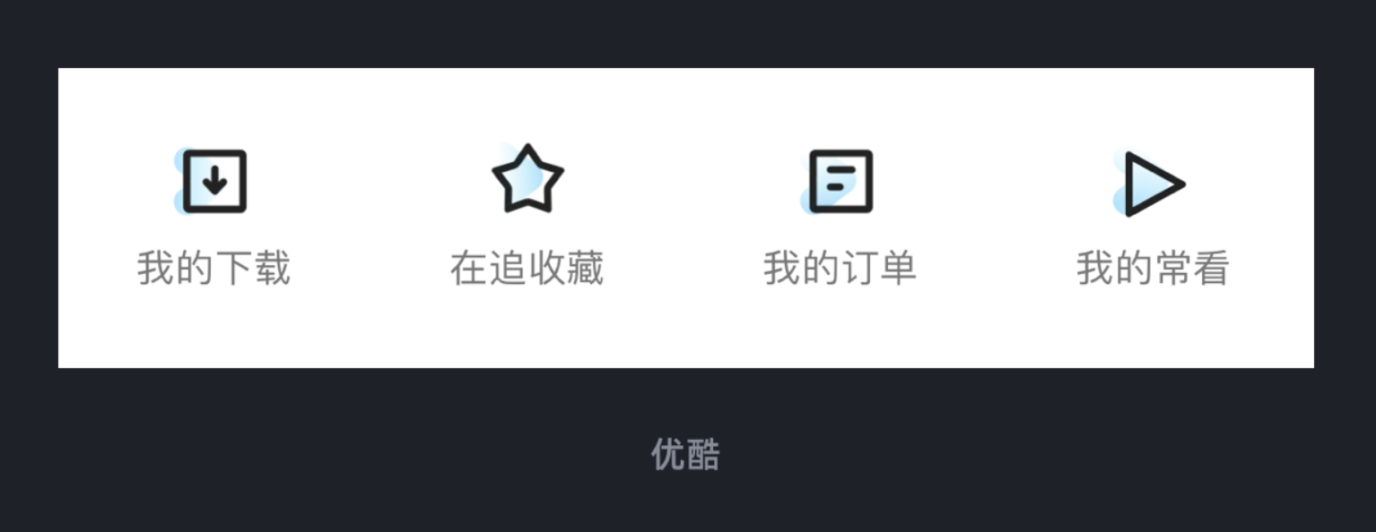 比如優(yōu)酷個(gè)人中心的圖標(biāo) ——“我的下載”“我的訂單” 這些功能按鈕,都采用簡(jiǎn)潔的線性風(fēng)格,但在圖標(biāo)的底層悄悄疊加了優(yōu)酷的品牌圖形元素。這種 “線性 + 品牌點(diǎn)綴” 的設(shè)計(jì),既保持了界面的清爽感,又讓圖標(biāo)跳出了 “千篇一律” 的困境,用戶看到圖標(biāo)時(shí),會(huì)下意識(shí)聯(lián)想到 “這是優(yōu)酷的設(shè)計(jì)”,慢慢形成記憶點(diǎn)。