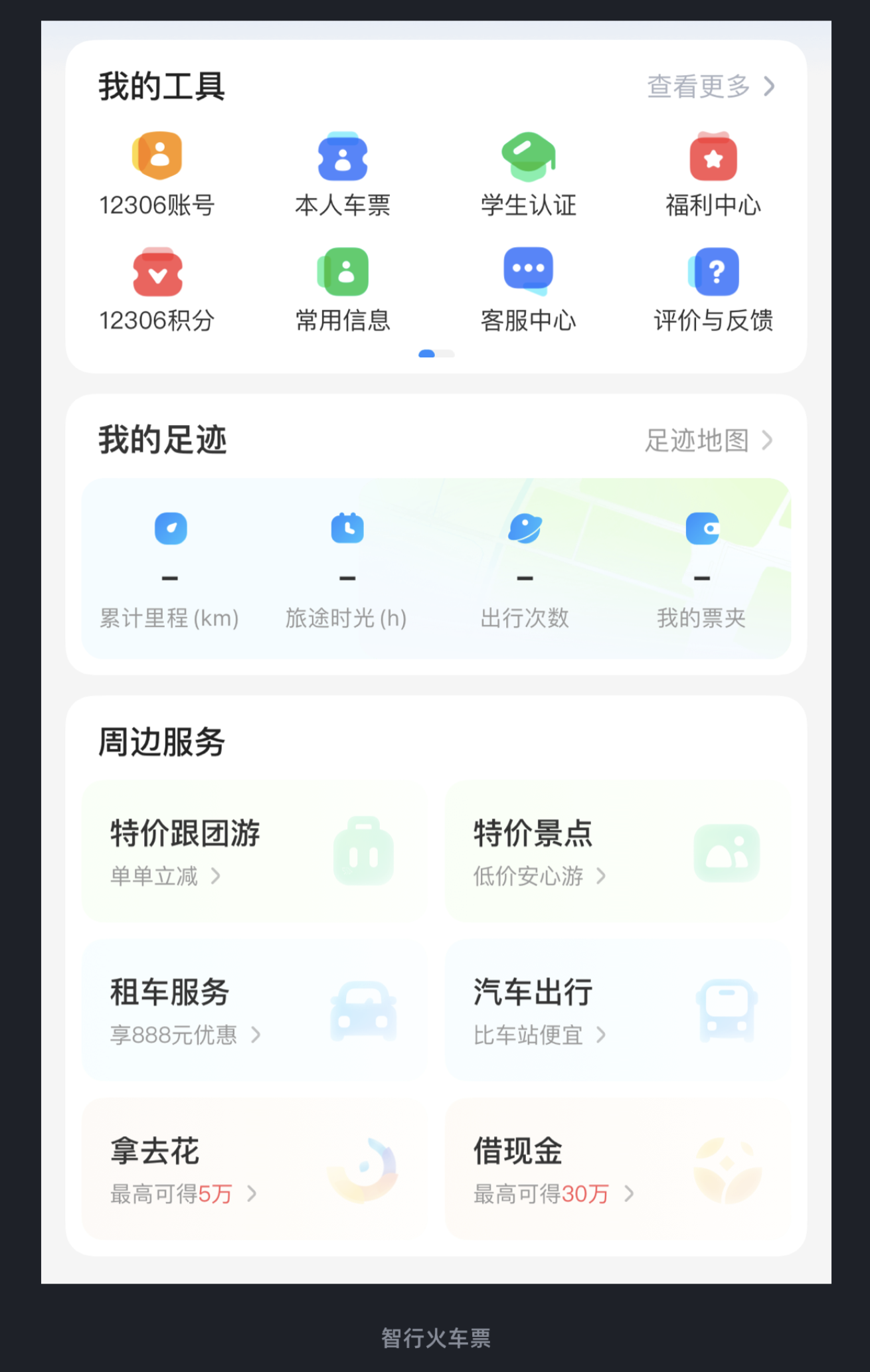 在智行火車票的個(gè)人中心里,有 “我的工具”“常用信息”“周邊服務(wù)” 三個(gè)主要版塊。其中 “我的工具”(12306 賬號(hào)、本人車票、學(xué)生認(rèn)證等)和 “常用信息”(我的足跡、我的票夾等)是用戶高頻使用的功能,所以這兩個(gè)版塊的圖標(biāo)用了 “高飽和度、低明度” 的配色,視覺(jué)張力強(qiáng),能第一時(shí)間吸引用戶的注意力;而 “周邊服務(wù)”(特價(jià)跟團(tuán)游、租車服務(wù)、拿去花等)是輔助功能,圖標(biāo)就采用了 “高明度、低飽和度” 的處理方式,顏色更淺、更柔和,視覺(jué)上故意 “弱化”。