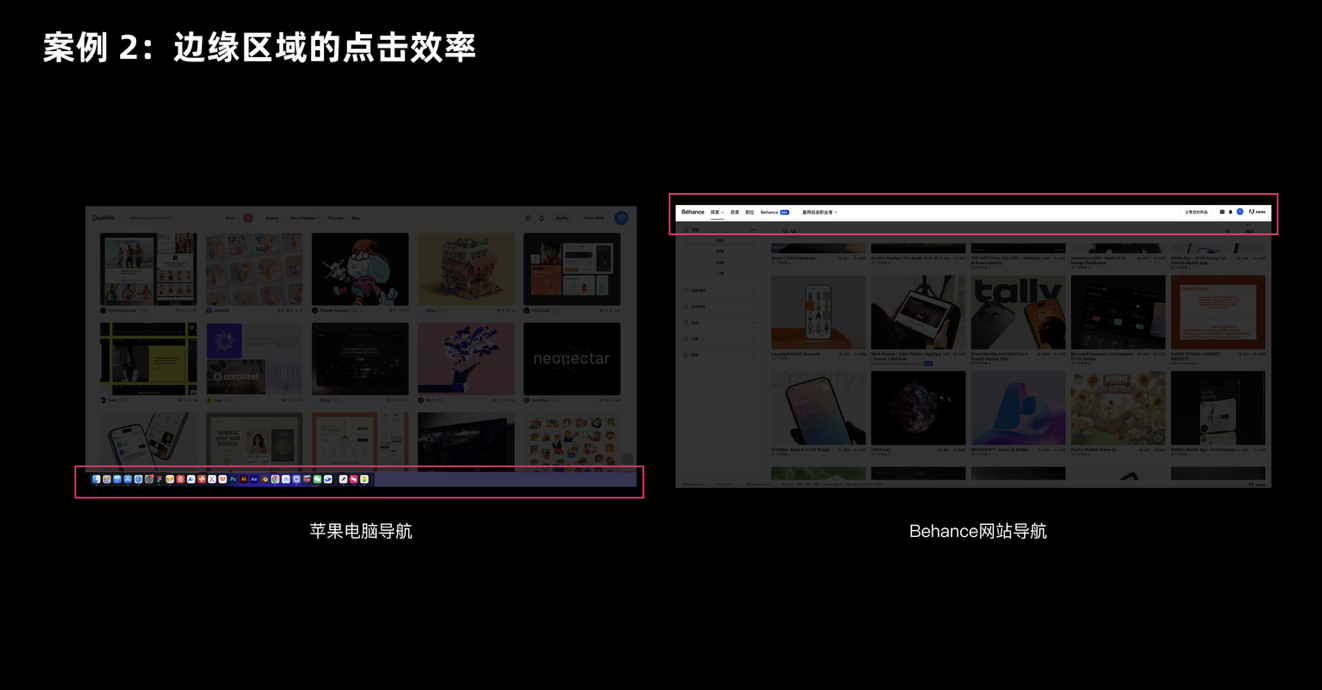 屏幕邊緣是被很多設計師忽略的 “黃金區(qū)域”—— 因為邊緣能擋住手指或鼠標的移動,相當于給目標加了 “天然邊界”,用戶不用刻意控制精度就能快速定位。這就是為什么 Mac 的 Dock 欄、Windows 的任務欄都放在屏幕底部或側邊,而不是中間。