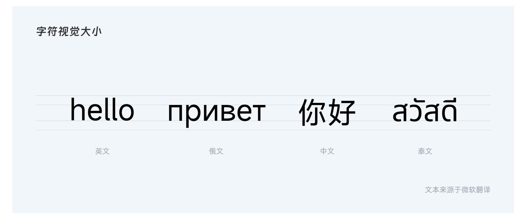 同一字號下,漢字的視覺感受明顯大于拉丁字母,而泰文則更小。比如 16 號字的 “你好”,視覺寬度相當(dāng)于 16 號字 “Hello” 的 1.5 倍,這會直接導(dǎo)致按鈕、標(biāo)簽的 “視覺擁擠度” 差異 —— 中文按鈕 100px 寬足夠,英文可能需要 120px,俄文則需要 150px。