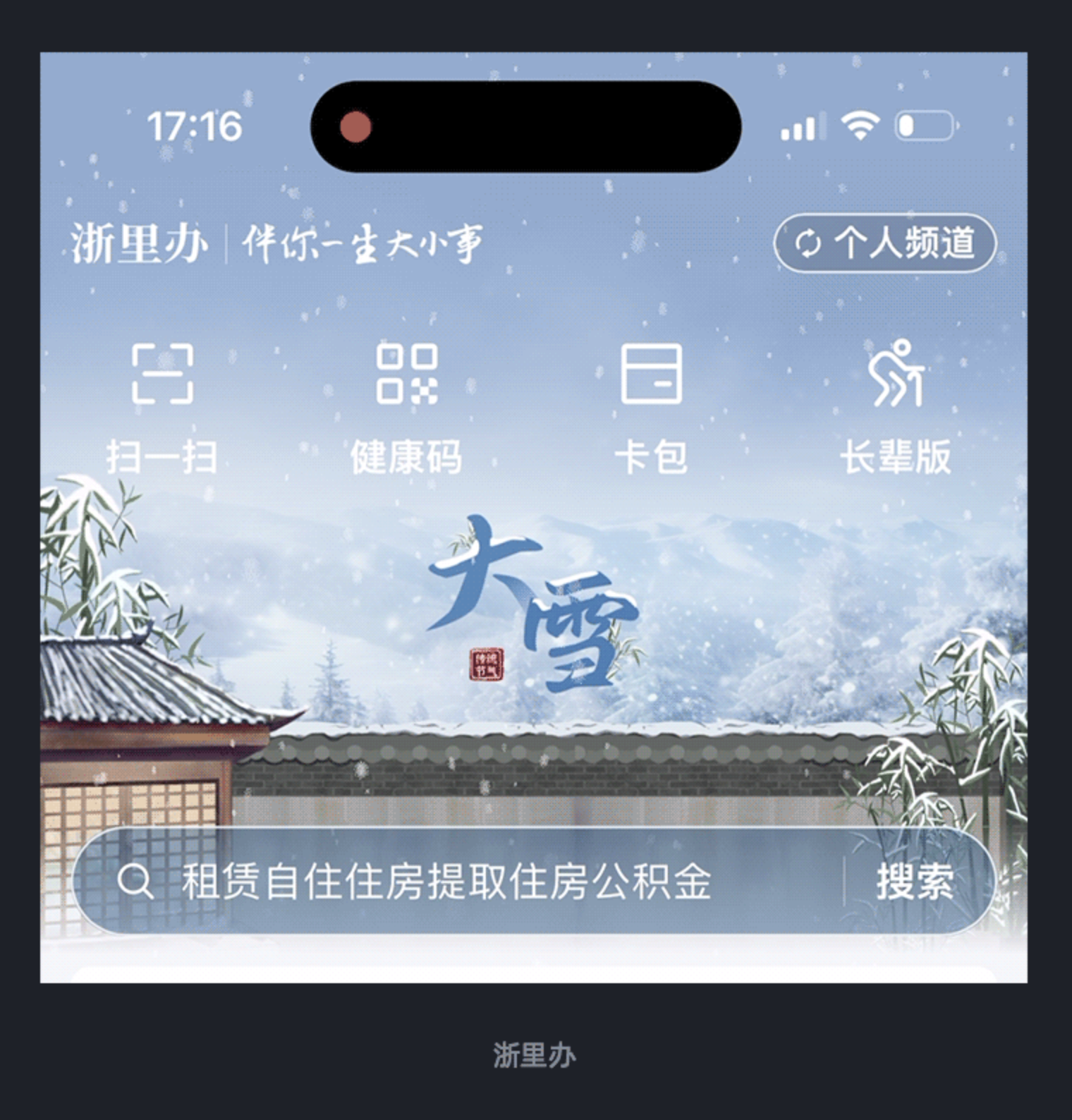 產(chǎn)品的溫度往往體現(xiàn)在場景化的細節(jié)中,應(yīng)景式背景設(shè)計能讓用戶在特定時刻感受到專屬關(guān)懷。政務(wù) App “浙里辦” 深諳此道,在春節(jié)、中秋等傳統(tǒng)節(jié)日,或是立春、冬至等節(jié)氣當天,會同步更新頂部視覺區(qū)域的背景。