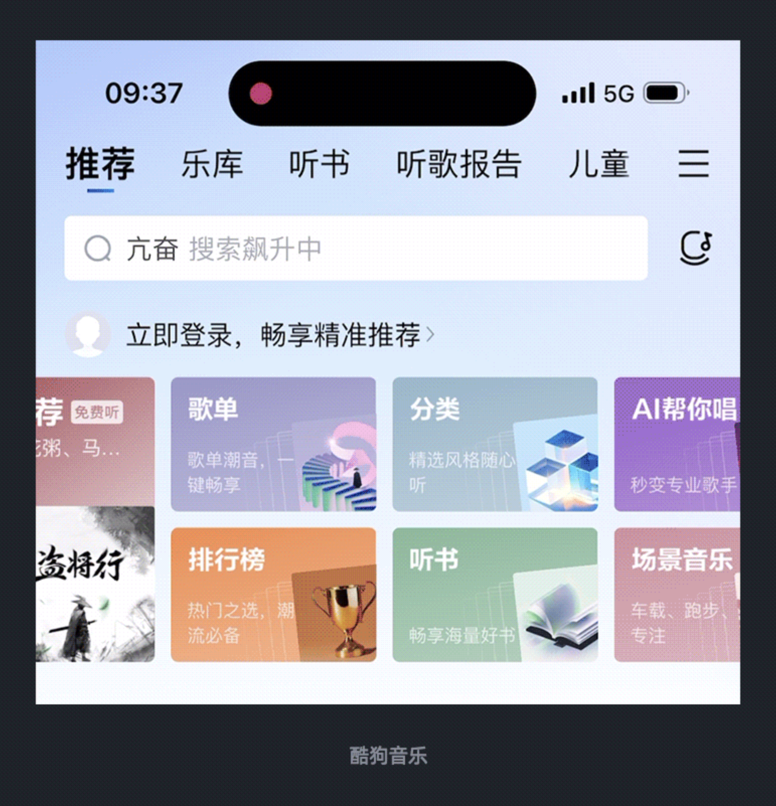 瓷片區(qū)是 App 承載多元功能的核心模塊,而自適應(yīng)布局則讓其兼顧實用性與擴展性??峁芬魳肺吹卿洜顟B(tài)下的首頁推薦板塊,采用了動態(tài)自適應(yīng)瓷片區(qū)設(shè)計:滑動頁面時,模塊會根據(jù)內(nèi)容多少自動調(diào)整大小與排列方式,隱藏非核心信息以提升空間利用率。