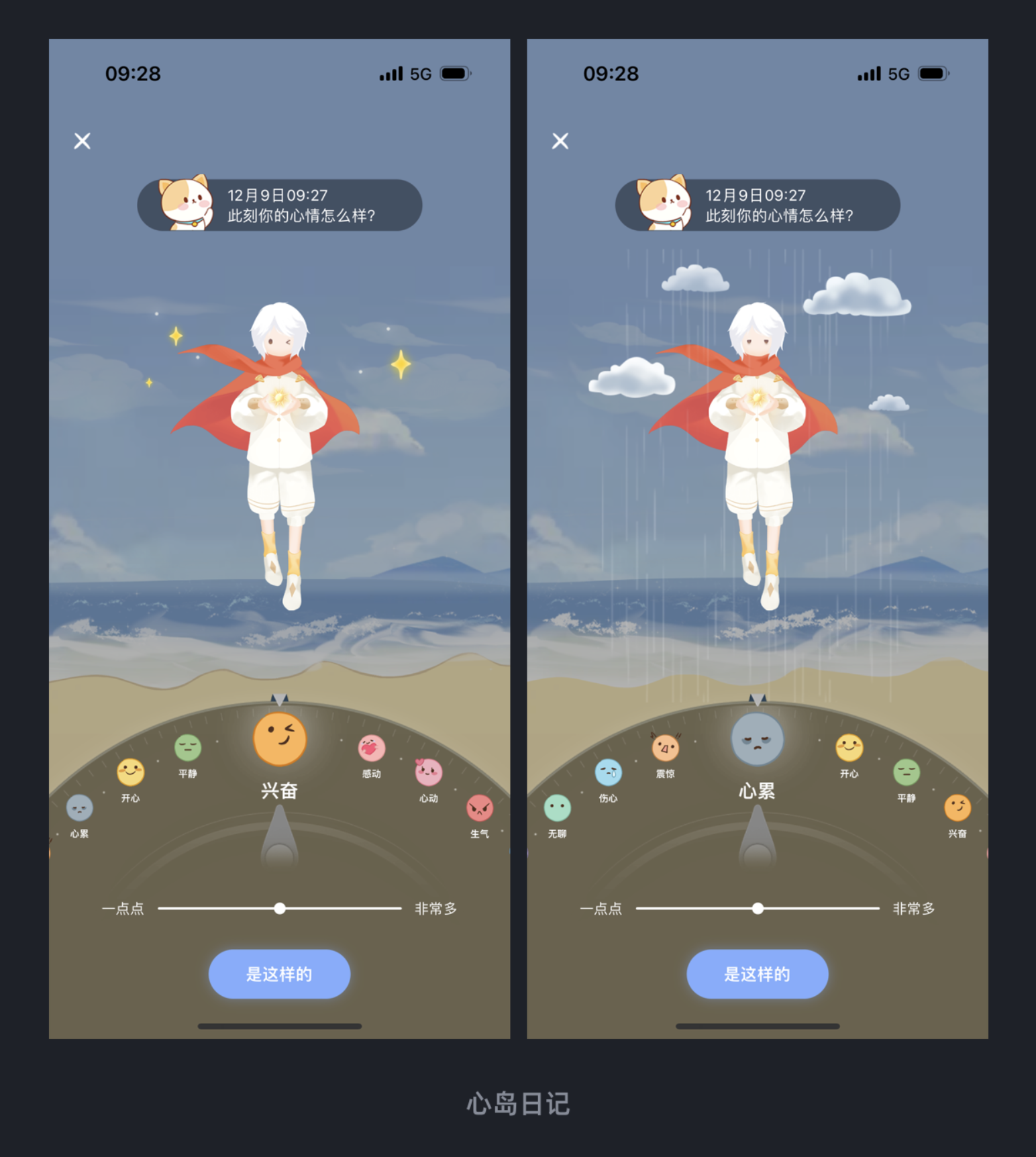 心情記錄類產(chǎn)品的核心是 “降低記錄門檻,強化情感共鳴”,心島日記的轉(zhuǎn)盤式心情記錄設(shè)計完美實現(xiàn)了這一點。用戶無需輸入文字,只需轉(zhuǎn)動轉(zhuǎn)盤,就能選擇 “開心”“平靜”“心累” 等心情狀態(tài),還能通過 “一點點”“非常多” 的強度調(diào)節(jié),精準傳遞當下感受。