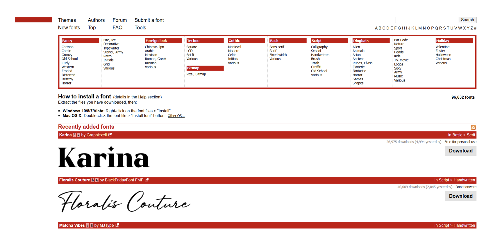 Dafont 是老牌免費字體網(wǎng)站,收錄超 4 萬款字體,風格從經(jīng)典到怪異應有盡有,以英文字體為主,也不乏設計師自制的創(chuàng)意中文字體。它的分類系統(tǒng)格外細致,可按主題、風格、用途篩選,節(jié)日海報、游戲界面等特殊場景的字體需求,在這里都能找到驚喜。