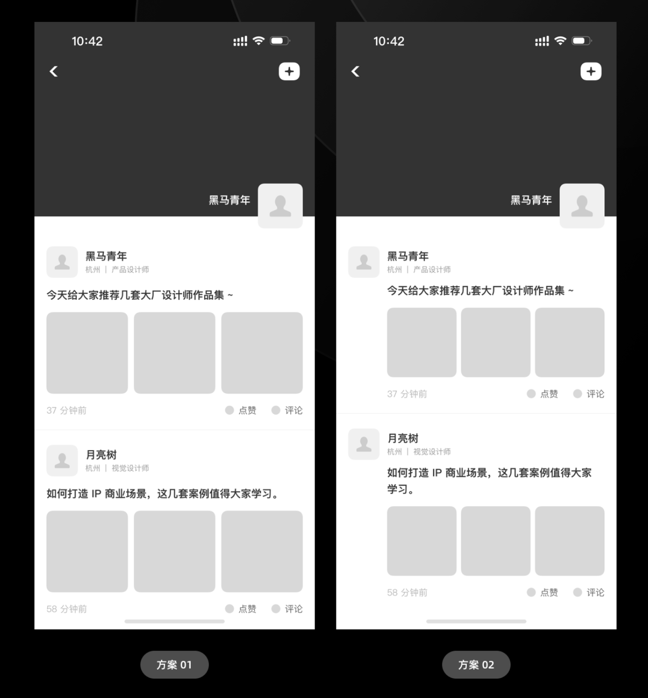 - 方案 02:左側(cè)展示發(fā)布者頭像與昵稱,右側(cè)展示動態(tài)內(nèi)容,強化用戶之間的關(guān)聯(lián)感