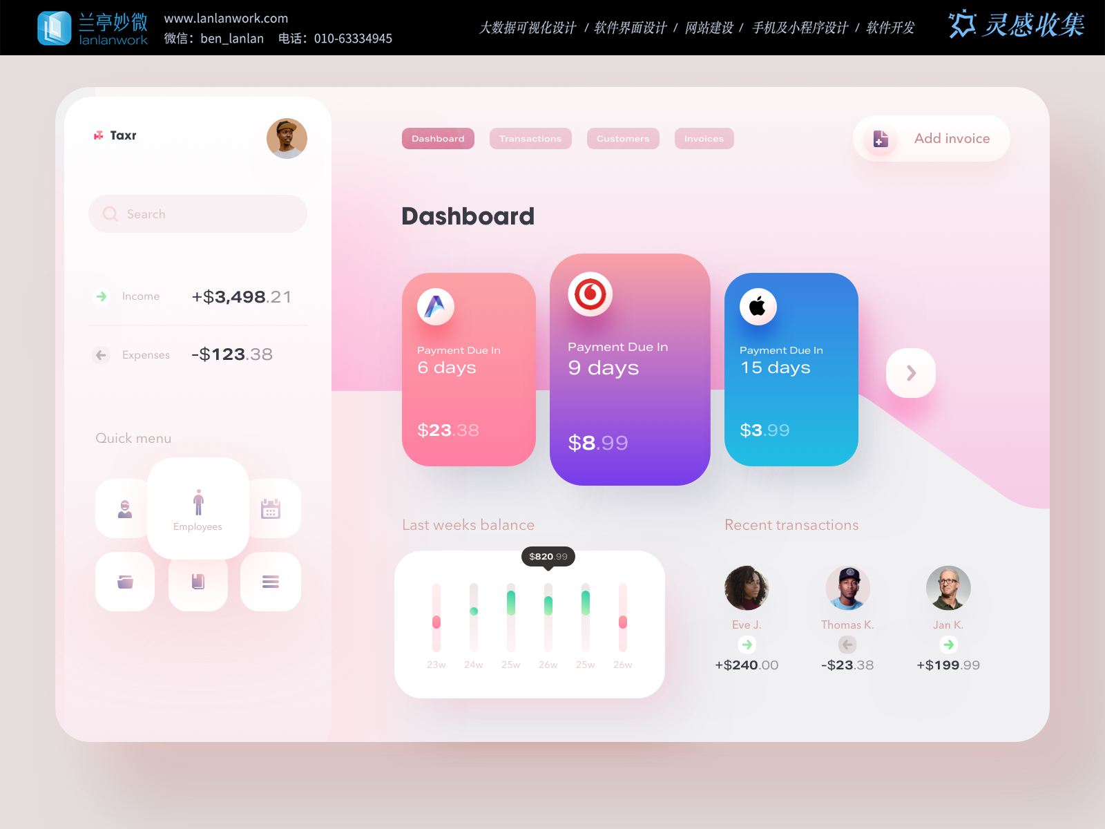 預(yù)判式功能前置:左側(cè) “Quick menu” 將 “員工”“日歷” 等高頻功能以圖標(biāo)形式前置,頂部 “Add invoice” 按鈕直接對(duì)應(yīng) “開(kāi)賬單” 的核心需求,操作路徑縮短至 1 步;
