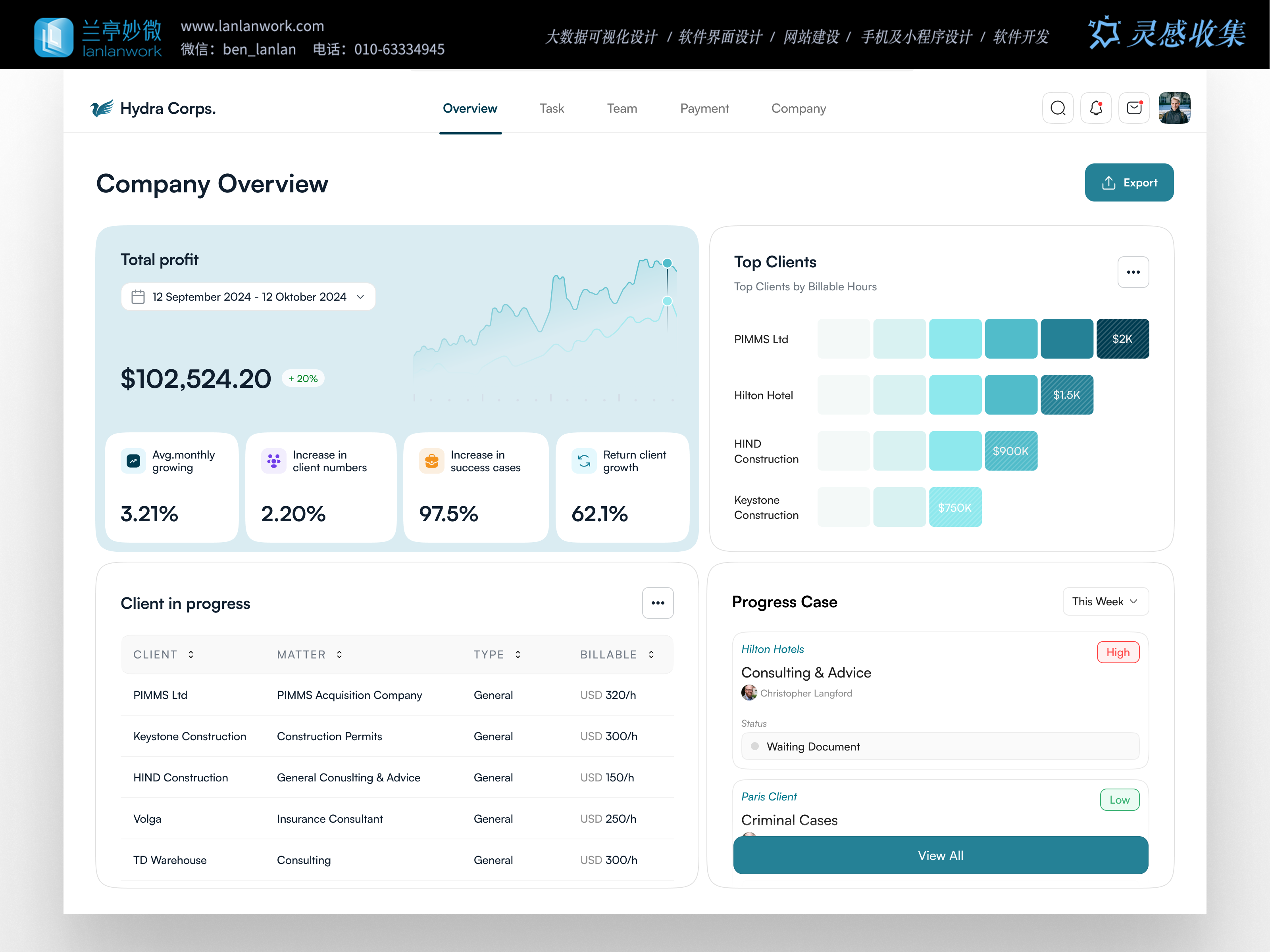 信息的 “極簡表達(dá)”:避免專業(yè)術(shù)語的堆砌,用 “Top Clients by Billable Hours” 等口語化標(biāo)題替代 “客戶營收貢獻(xiàn)分析”,二級指標(biāo)用 “3.21% Avg monthly growing” 的短句式呈現(xiàn),讓數(shù)據(jù)解讀成本降低 50%。
