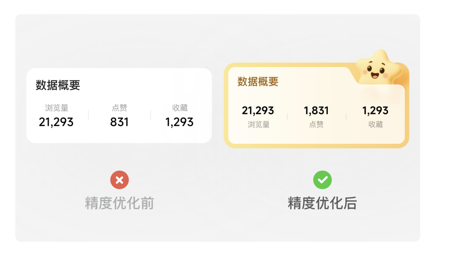 數(shù)據(jù)卡片的核心是傳遞數(shù)字信息,優(yōu)化需兼顧 “可讀性” 與 “視覺(jué)吸引力”,避免陷入 “純文字堆砌” 的誤區(qū)。