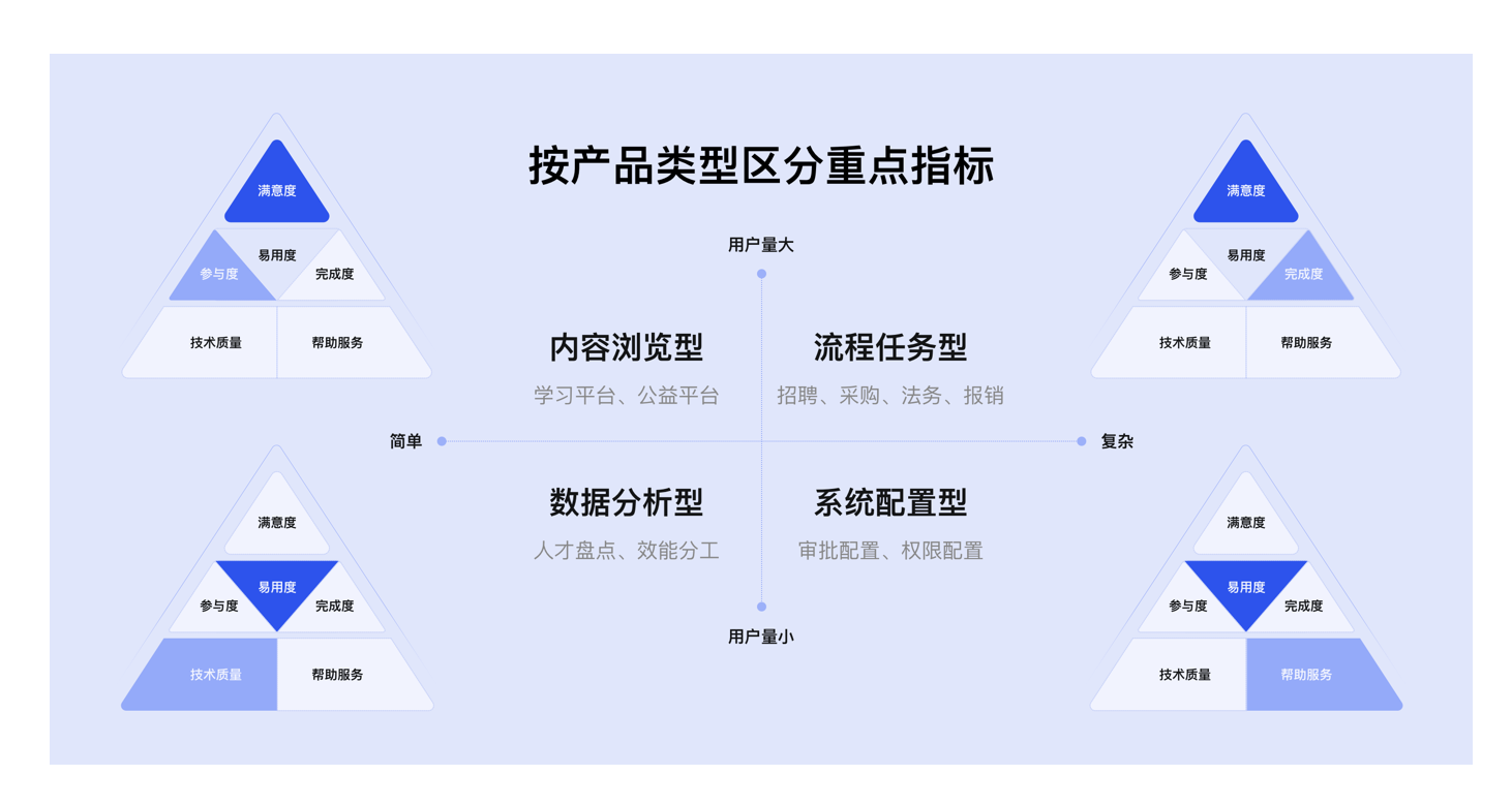 根據(jù) “用戶量大小” 與 “操作復(fù)雜度”,將產(chǎn)品分為四類,聚焦不同指標(biāo):