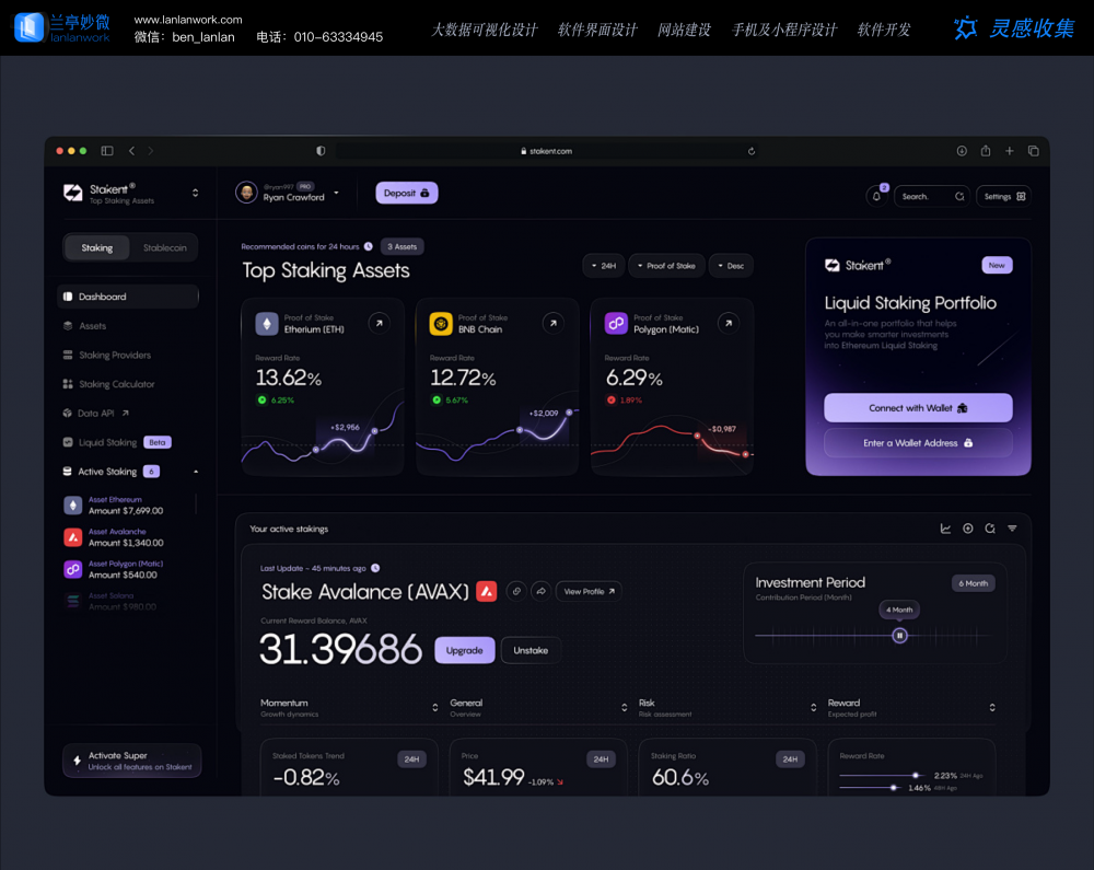 找不到按鈕、分不清功能區(qū)?這組設(shè)計(jì)的視覺(jué)引導(dǎo)堪稱教科書。每個(gè)界面只選 1 種高飽和強(qiáng)調(diào)色,核心按鈕用高亮 + 留白突出;功能區(qū)用卡片 + 淺陰影分層,像加密貨幣后臺(tái)的質(zhì)押資產(chǎn)模塊,清晰得像文件夾,新人上手不用看手冊(cè)。