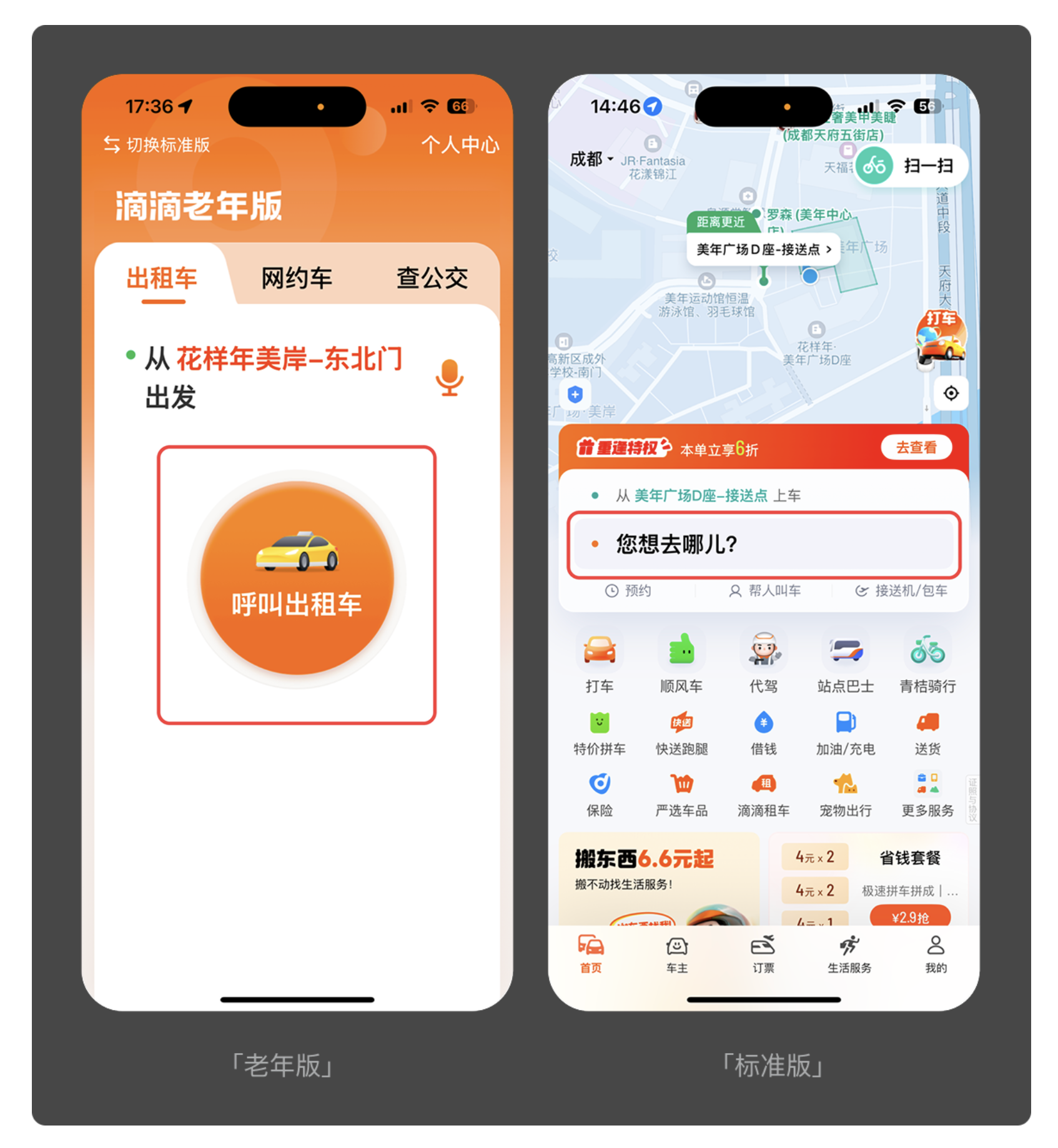 清晰的界面是老人順利操作的基礎(chǔ)。老年用戶的視覺敏感度下降,過小的字體、密集的圖標、復雜的排版都會給他們帶來困擾。滴滴老年版將主要功能模塊以大字體、高對比度的圖標形式呈現(xiàn),摒棄了標準版中繁雜的附加服務入口,讓 “打車” 這一核心功能一目了然;淘寶老年版則聚焦老人常用的 “購物、訂單、客服” 功能,隱藏了百億補貼、直播帶貨等復雜板塊,用簡潔的布局和醒目的文字,降低了視覺識別成本。好的適老化界面設(shè)計,就像給產(chǎn)品 “畫重點”,讓老人無需費力尋找,就能快速定位所需功能。