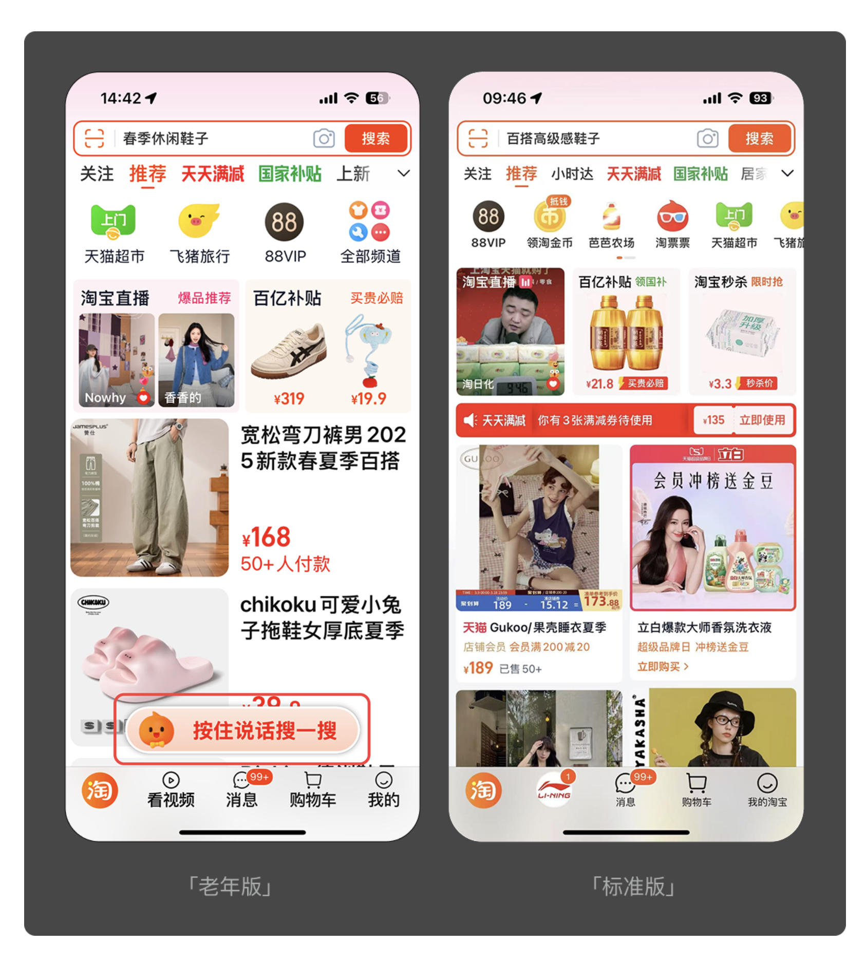打字對于許多老人而言是一大難題 —— 視力模糊導致按鍵不準、拼音基礎(chǔ)薄弱難以拼寫,這些都讓文字輸入成為數(shù)字使用的 “攔路虎”。語音操作的引入,恰好解決了這一痛點。淘寶老年版在底部導航欄設(shè)置了顯眼的 “按住說話搜一搜” 按鈕,老人只需說出商品名稱,即可完成搜索,無需手動輸入;中國工商銀行老年版也加入了 “語音操作” 功能,查詢賬戶余額、辦理生活繳費、購買理財產(chǎn)品等操作,都能通過語音指令完成,極大簡化了操作流程。語音交互以更自然的方式搭建起老人與產(chǎn)品的溝通橋梁,讓操作門檻大幅降低。