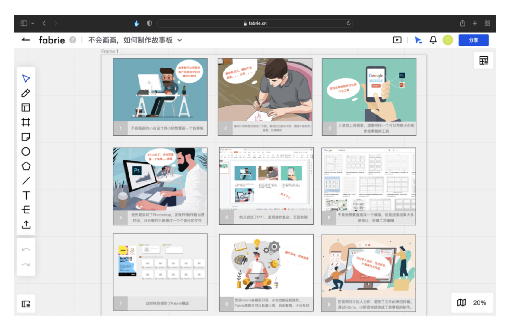- 故事板:即使不會畫畫,也能通過模板快速搭建場景,用圖片、文字還原用戶使用產(chǎn)品的過程,直觀展現(xiàn)設(shè)計價值。