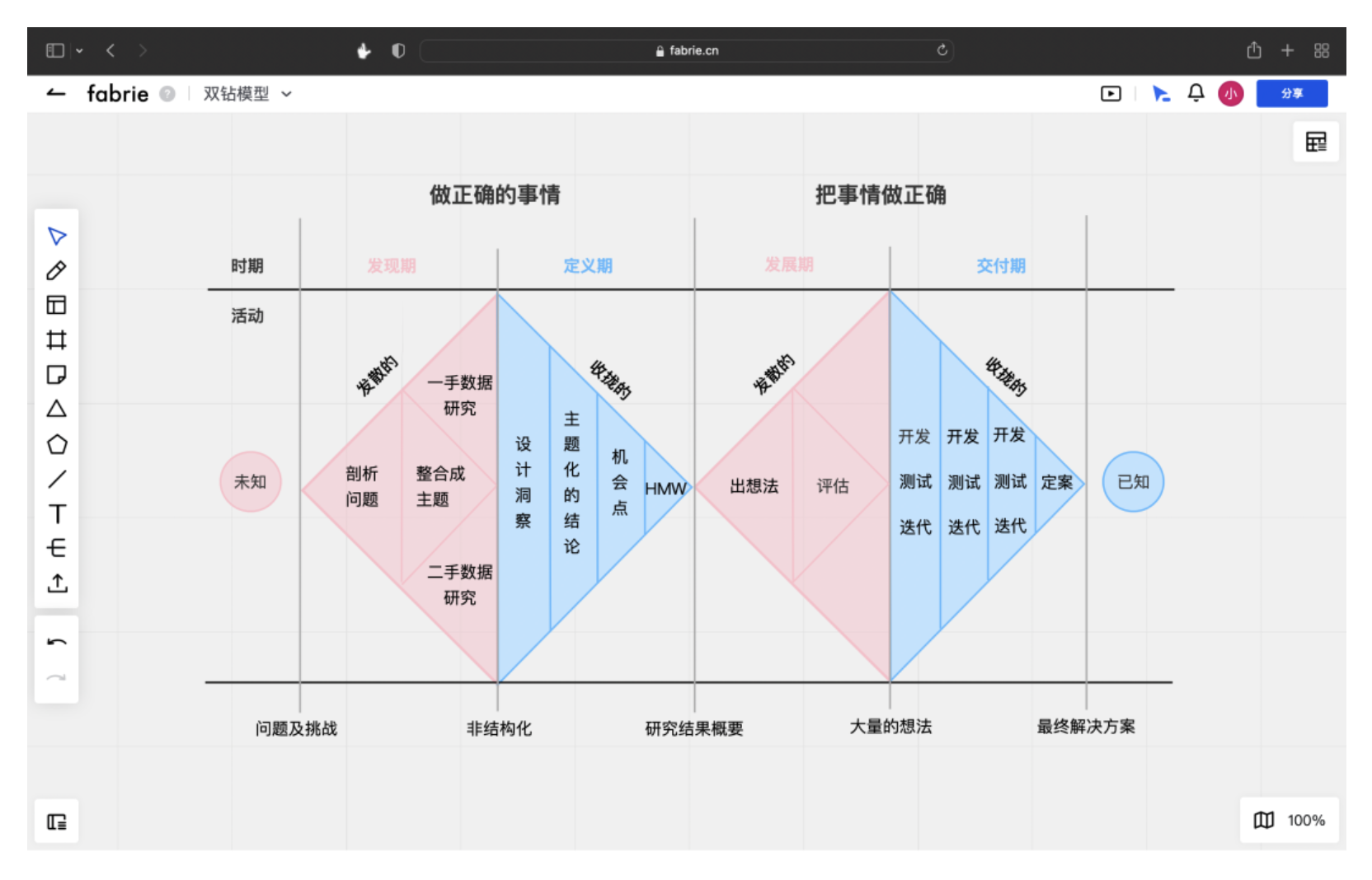 雙鉆模型是設(shè)計思維的核心框架,分為發(fā)現(xiàn)期、定義期、發(fā)展期、交付期四個階段,通過 “發(fā)散 - 收攏” 的循環(huán)確保設(shè)計方向正確且執(zhí)行到位。但很多設(shè)計師因缺乏工具支撐,難以完整踐行這一流程。