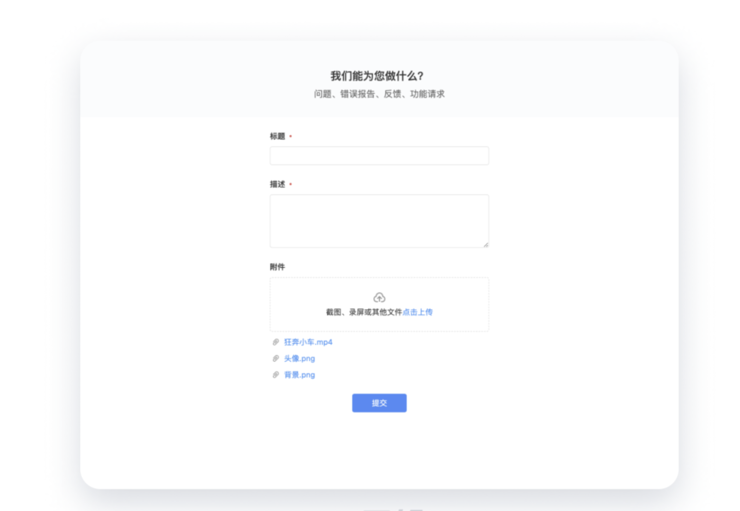 示例場景:簡單的錯(cuò)誤報(bào)告表單,僅包含 "問題標(biāo)題"" 描述 ""附件" 三個(gè)字段,采用單列布局讓用戶快速完成提交。