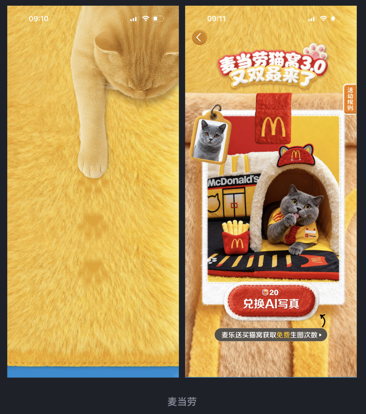麥當(dāng)勞 App 在 “貓窩 3.0” 活動中,將下拉刷新動作與貓爪元素完美結(jié)合。用戶下拉頁面時,會觸發(fā)貓爪撓動的趣味動畫,松開后直接進(jìn)入 “貓咪寫真” 活動頁面。這種設(shè)計(jì)沒有生硬地插入廣告,而是用符合品牌調(diào)性的創(chuàng)意互動,讓營銷活動變得生動有趣,既吸引了用戶注意力,又提升了活動參與度,實(shí)現(xiàn)了功能與營銷的自然融合。