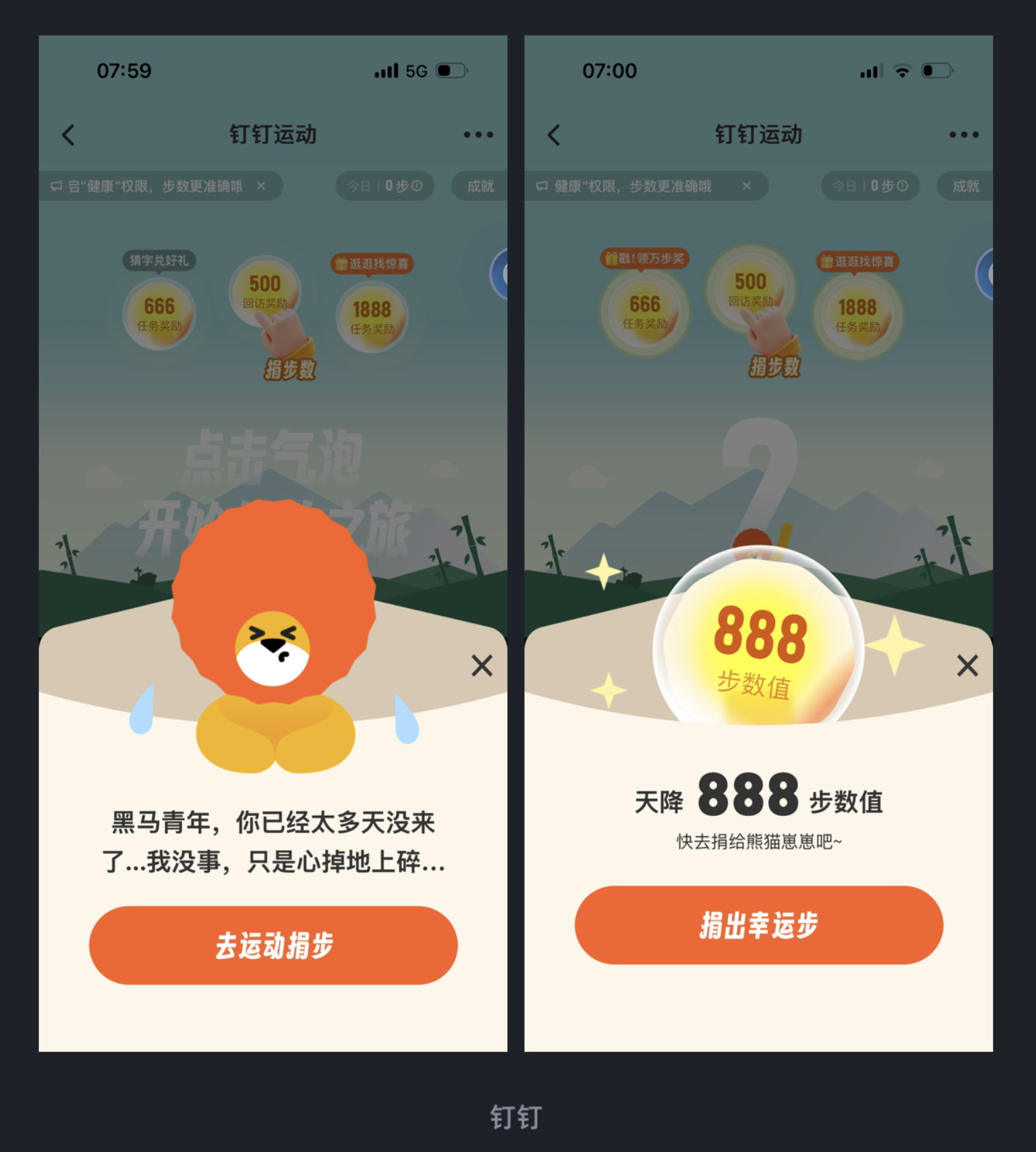 釘釘運(yùn)動為了激活沉寂用戶參與捐步,采用了極具感染力的文案溝通方式。面對長時間未登錄的用戶,文案以 “黑馬青年,你已經(jīng)太多天沒來 了... 我沒事,只是心掉地上碎...” 的擬人化表達(dá)傳遞失落感,同時結(jié)合 “天降幸運(yùn)步” 的福利機(jī)制,讓用戶在情感共鳴與幸運(yùn)心理的雙重驅(qū)動下,主動參與捐步。這種設(shè)計(jì)跳出了功能型文案的框架,用情感連接用戶,讓產(chǎn)品更具人情味。