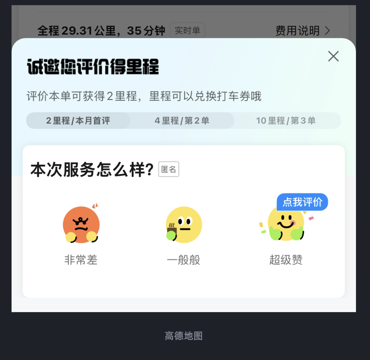 高德地圖在打車服務(wù)結(jié)束后,設(shè)計(jì)了多維度的反饋場景。不僅會詢問 “車內(nèi)空氣是否清新” 等具體服務(wù)細(xì)節(jié),還推出 “評價得里程” 的激勵機(jī)制 —— 用戶評價后可獲得里程,進(jìn)而兌換打車券。這種設(shè)計(jì)一方面能幫助平臺收集真實(shí)反饋,推動司機(jī)服務(wù)優(yōu)化;另一方面讓用戶意識到自己的意見能直接影響后續(xù)服務(wù)質(zhì)量,同時獲得實(shí)際福利,從而更愿意主動參與反饋,形成良性循環(huán)。