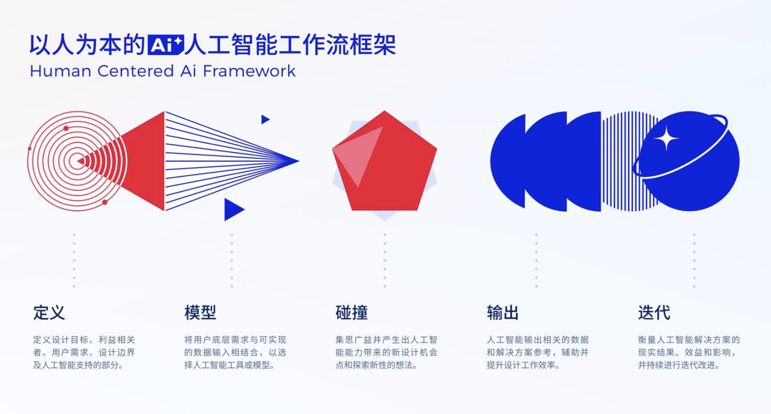 以人為本的設(shè)計(jì)核心,在 AI 時(shí)代需要與技術(shù)實(shí)現(xiàn)深度融合,我們構(gòu)建了 “定義 - 建模 - 共創(chuàng) - 輸出 - 迭代” 的全鏈路 AI UX 設(shè)計(jì)工作流,讓設(shè)計(jì)既貼合用戶需求,又能充分發(fā)揮 AI 技術(shù)價(jià)值: