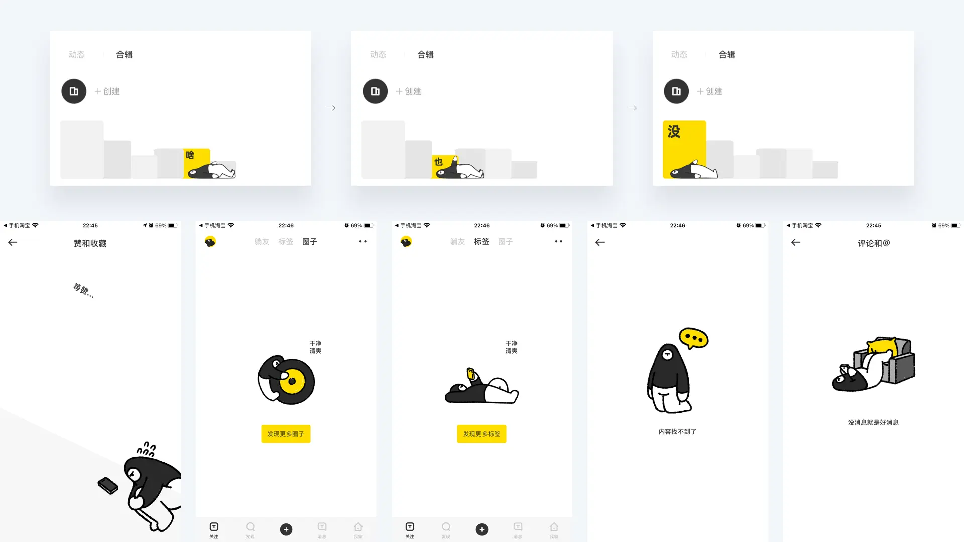 設(shè)計(jì)師可結(jié)合產(chǎn)品屬性與品牌視覺(jué)體系,延展圖形設(shè)計(jì),搭配動(dòng)效、插畫等形式,豐富缺省頁(yè)內(nèi)容。比如躺平的空白頁(yè),設(shè)計(jì)出賤萌有趣的視覺(jué)場(chǎng)景,一句 “沒(méi)消息就是好消息”“內(nèi)容找不到了,發(fā)現(xiàn)更多圈子”,讓用戶在無(wú)奈的場(chǎng)景下會(huì)心一笑,將負(fù)面情緒轉(zhuǎn)化為輕松的體驗(yàn),讓產(chǎn)品充滿趣味性與人情味。
