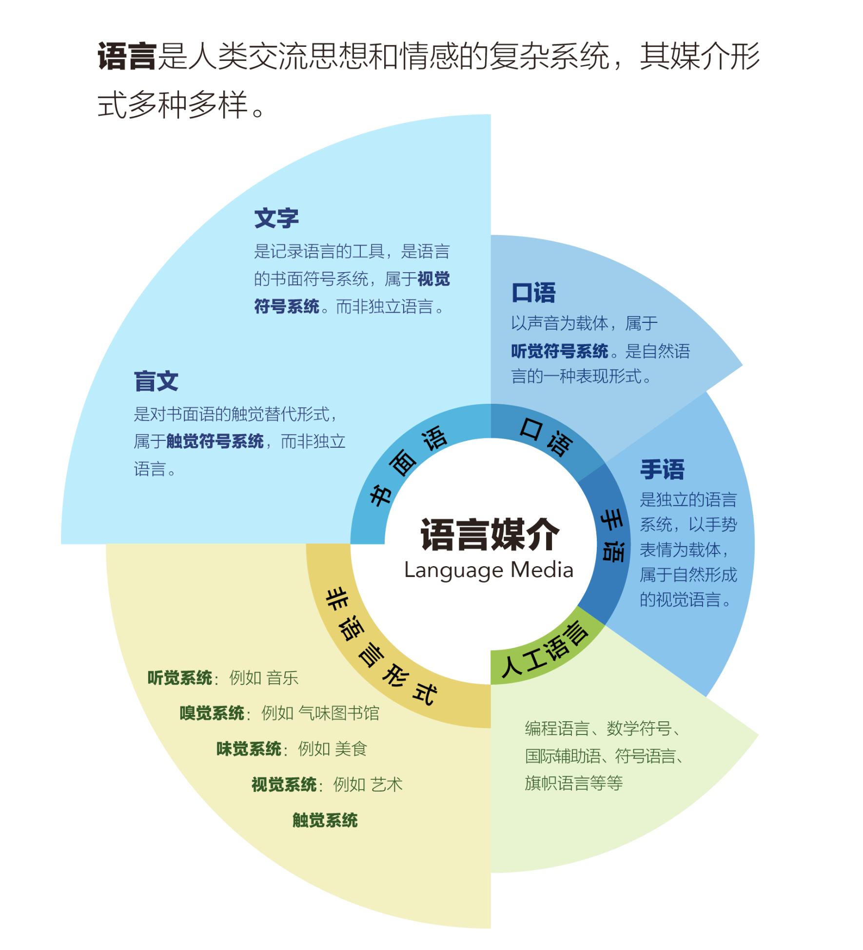 - 自然語言:依托人類自然交流形成,是最基礎(chǔ)的語言媒介,包含口語、手語、書面語三大類。其中口語以聲音為載體,屬于聽覺符號系統(tǒng);手語以手勢、表情為載體,是獨立的視覺語言系統(tǒng);書面語則包含文字與盲文,文字是記錄語言的視覺符號工具,盲文則是書面語的觸覺替代形式,歸屬于觸覺符號系統(tǒng)。