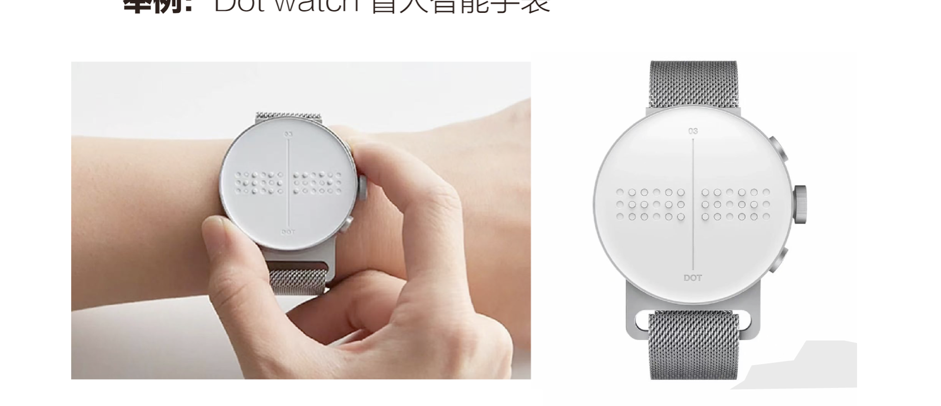 韓國 Dot Incorporation 公司研發(fā)的 Dot watch 盲人智能手表,則讓盲文與現(xiàn)代科技完美融合。表盤的 24 個盲點可通過上下浮動形成盲文凸點,不僅能清晰 “訴說” 時間,還能將短信、社交信息、來電姓名與號碼實時轉(zhuǎn)化為盲文,讓視障人群無需等待即可獲取信息;同時,手表支持私密瀏覽備忘錄,真正打破了視障人群的信息接收壁壘,讓科技為盲文賦能,讓設(shè)計服務(wù)于生活。