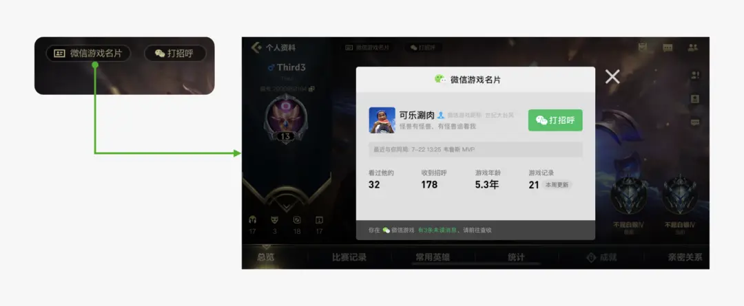我對設計潛臺詞的思考,源于一次微信游戲名片的設計實踐。微信游戲名片的核心功能,是在游戲 APP 中展示玩家的游戲信息,為玩家間的社交搭建橋梁,讓不同游戲的玩家能便捷查看彼此的微信游戲數(shù)據(jù)。