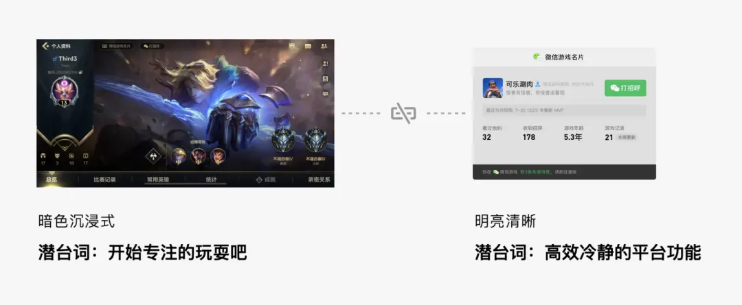 回到微信游戲名片的設計案例,從潛臺詞的視角分析,問題便迎刃而解。市面上主流的頭部游戲,界面大多采用暗色沉浸式風格,這種視覺設計的潛臺詞是:“放下外界干擾,開始專注的游戲體驗吧”,目的是為玩家營造專注、沉浸的游戲心流。