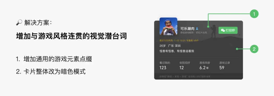 而最初的微信游戲名片,采用明亮清晰的設計風格,其潛臺詞更偏向 “高效、冷靜的平臺功能工具”。游戲界面與名片界面的潛臺詞形成強烈反差,這正是用戶覺得違和、生硬的核心原因 —— 視覺潛臺詞的割裂,打破了玩家的游戲沉浸感。