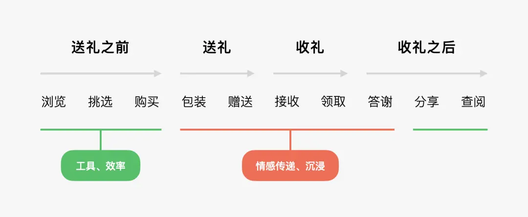首先梳理禮品站的完整使用路徑,發(fā)現(xiàn)不同頁面的情感承載度差異顯著:一部分是挑選、購買道具的工具類頁面,核心需求是高效、便捷;另一部分是贈送、接收、拆禮物的核心頁面,核心需求是完成用戶的情感傳遞。顯然,后者是情感化設計的關鍵切入點。