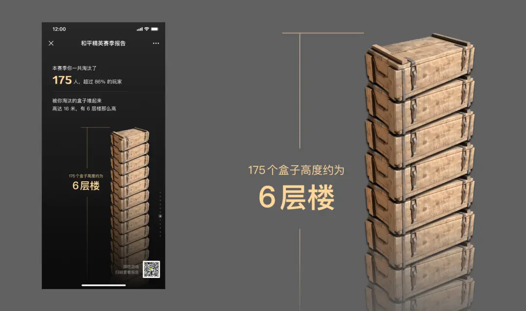 一是將 “擊殺人數(shù)” 具象為現(xiàn)實中的 “樓層高度”。和平精英中,被淘汰的玩家會變成存放裝備的小木盒,我們便將玩家賽季總擊殺數(shù),轉化為 “盒子堆疊的高度”—— 比如 “本賽季淘汰 175 人,盒子堆疊高達 16 米,相當于 6 層樓的高度”,用現(xiàn)實中可感知的 “樓層高度”,讓玩家直觀感受到自己的擊殺成果,遠比冰冷的數(shù)字更有沖擊力。
