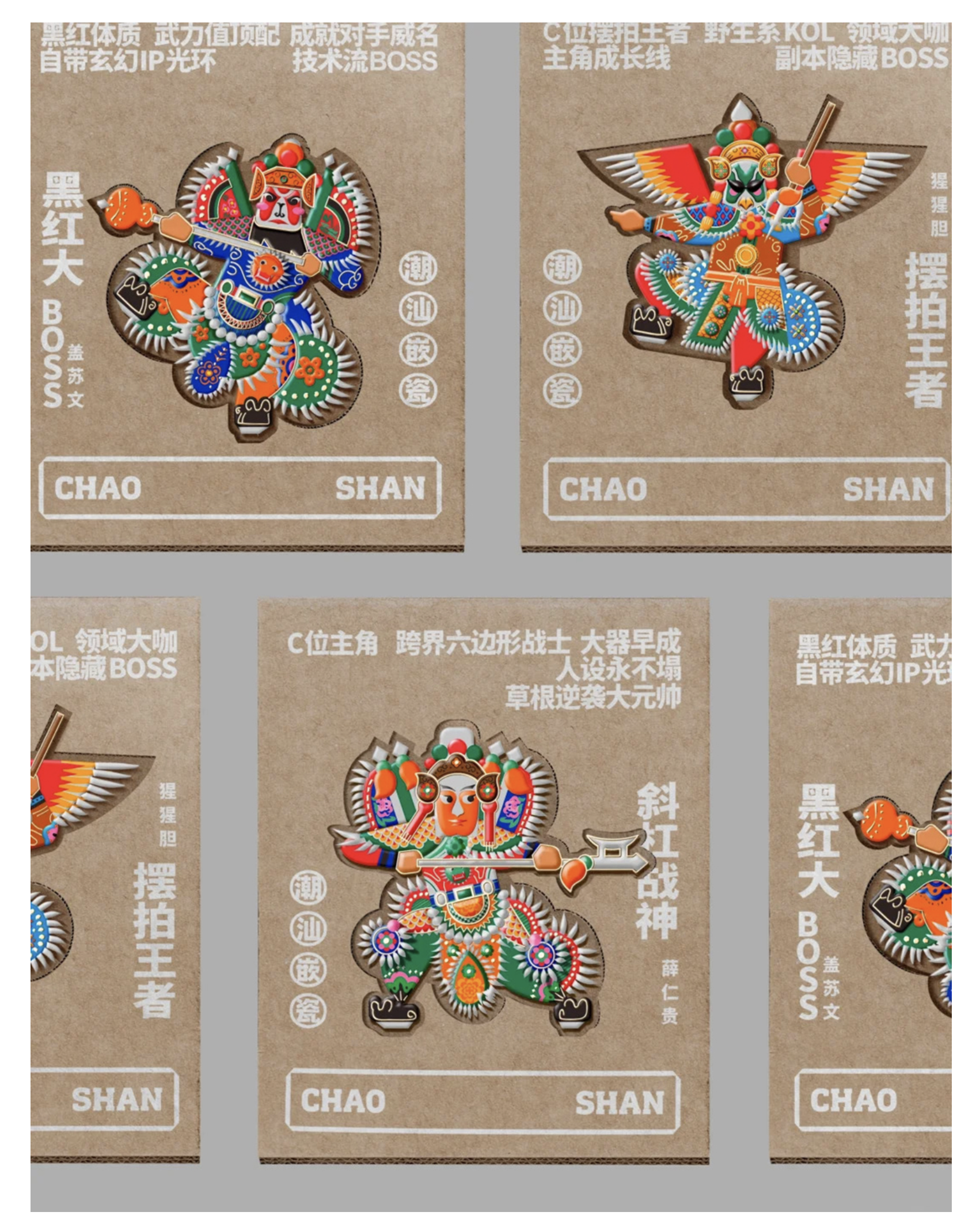 在視覺表達上,他采用極具沖擊力的視覺形式,將潮汕文化符號與潮流設計手法結(jié)合。黑紅為主的經(jīng)典配色,既契合潮汕文化中喜慶、莊重的氛圍,又符合當代潮流的審美偏好;粗糲有力的字體設計,搭配 “CHAO SHAN” 的英文字樣,讓地域文化與國際潮流接軌;將嵌瓷的凹凸質(zhì)感、木雕的紋樣細節(jié)轉(zhuǎn)化為平面視覺符號,讓非遺技藝的美感在海報、文創(chuàng)產(chǎn)品中被直觀感知。同時,他將傳統(tǒng)人物的人設標簽與視覺形象結(jié)合,讓薛仁貴、蓋蘇文的形象兼具傳統(tǒng)韻味與潮流個性,成為極具識別度的文化 IP。