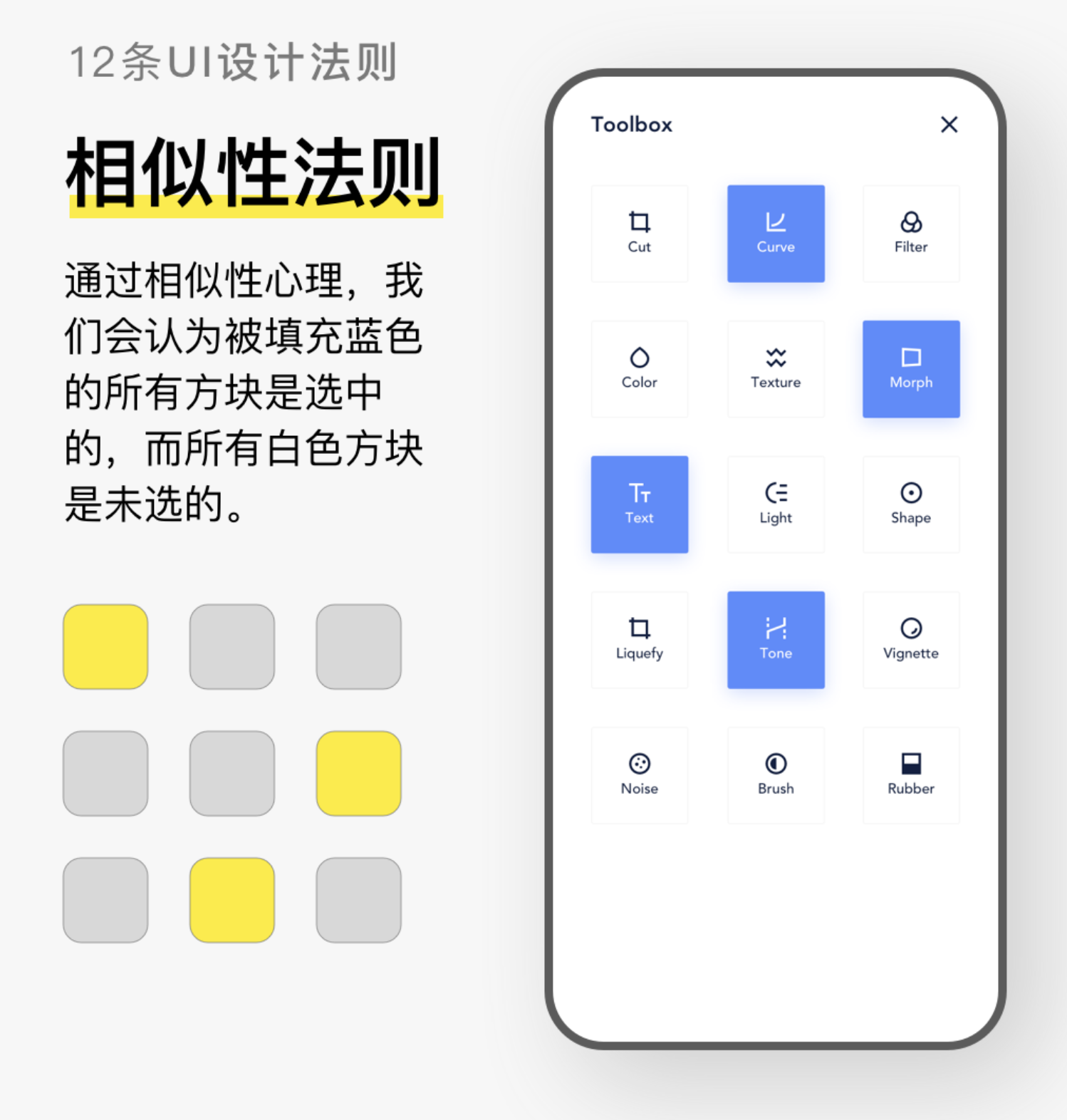 視覺特征相似(形狀、大小、顏色、質(zhì)感)的元素歸為一類,主觀判定其具備相同功能或?qū)傩?。這一法則是保證界面一致性的核心基礎(chǔ)。