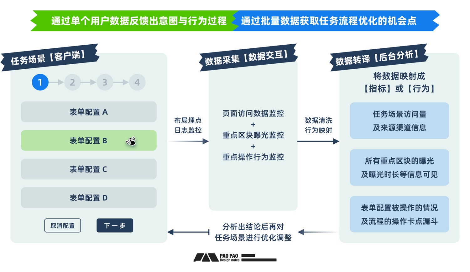 這些數(shù)據(jù)埋點主要是為業(yè)務目標的洞察分析服務,也就是說業(yè)務目標中需要采集用戶行為數(shù)據(jù)時,埋點就要派上用場了,相比傳統(tǒng)的業(yè)務日志,埋點可以收集到更加全面的界面交互的行為數(shù)據(jù),能夠簡易的還原出一套線上用戶的使用情景,而不僅限于一些業(yè)務后臺就能統(tǒng)計出的轉(zhuǎn)化率或基礎數(shù)據(jù)等;