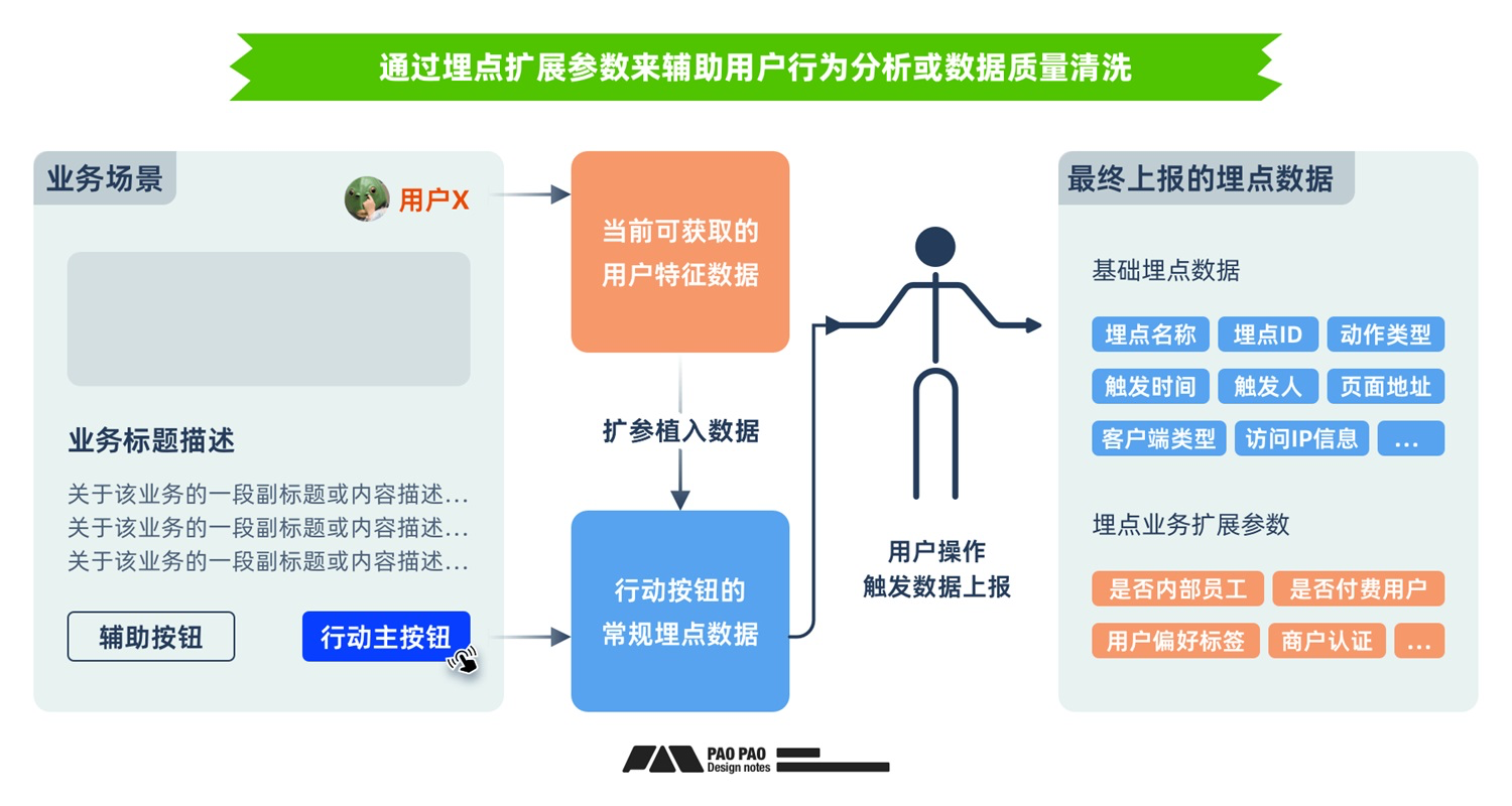 通常這些埋點會分為“頁面訪問(PV、UV)、區(qū)塊曝光(區(qū)域、時長)、按鈕操作(動作、狀態(tài))”三大類型,并攜帶交互元素和操作者的各類特征信息參數(shù),便于我們知曉更多的場景細節(jié)與用戶情況,例如知曉這個「免費試用」按鈕是對應了那個產(chǎn)品?點擊的用戶是否已開通這個產(chǎn)品?這個用戶是否為付費用戶?是否個人還是商家類型?用戶從哪個渠道進來的等,而且這些植入在產(chǎn)品代碼中的埋點可以不間斷持續(xù)的采集和配套產(chǎn)品迭代進行維護,可以幫助業(yè)務團隊獲取大量有效數(shù)據(jù)用作業(yè)務分析決策。