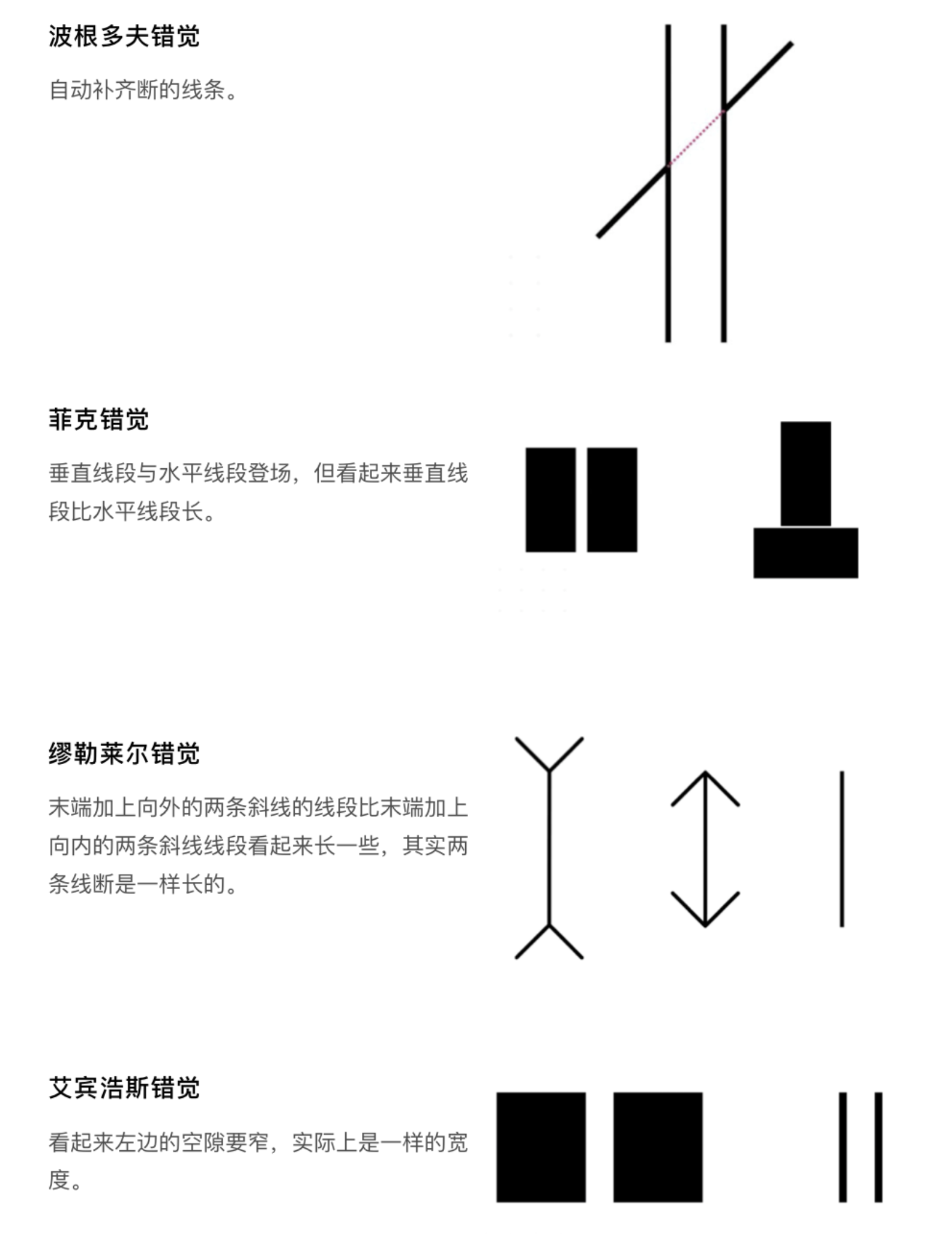 - 幾何感知錯(cuò)覺:黑林錯(cuò)覺、馮特錯(cuò)覺中平行線條看似彎曲,龐佐錯(cuò)覺中矩形看似頂寬底窄,厄任斯坦錯(cuò)覺中矩形邊框看似彎曲,這些錯(cuò)覺提醒我們,在設(shè)計(jì)直線型界面元素(如邊框、分割線、按鈕)時(shí),需通過適度的視覺調(diào)整抵消錯(cuò)覺影響,保證界面規(guī)整性;菲克錯(cuò)覺、垂直水平錯(cuò)覺中,等長(zhǎng)的垂直線段比水平線段視覺上更長(zhǎng),繆勒萊爾錯(cuò)覺中末端斜線朝向影響線段長(zhǎng)度感知,這一規(guī)律常被用于按鈕、輸入框的尺寸設(shè)計(jì),讓界面元素在視覺上達(dá)到平衡。