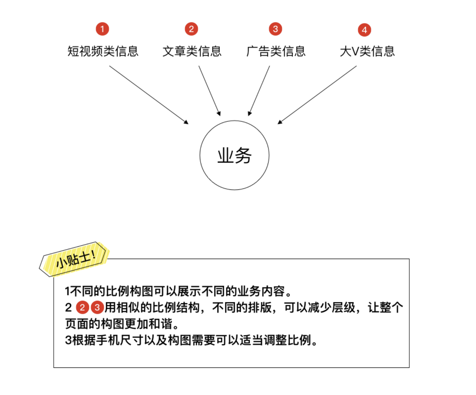 按業(yè)務(wù)維度適配比例,一屏頁面中可根據(jù)不同業(yè)務(wù)線的信息屬性,搭配多種近似黃金分割比,比如短視頻類信息用 1:1、文章類信息用 2:3、廣告類信息用 5:8,用差異化比例區(qū)分信息層級,讓構(gòu)圖和諧且有層次;二是